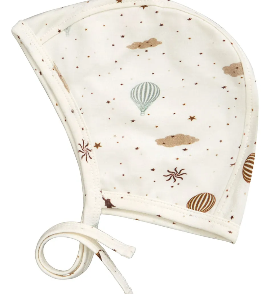 Sød Cam Cam Copenhagen babyhjelm i cremehvid med et alloverprint af stjerner, skyer, luftballoner og drager.