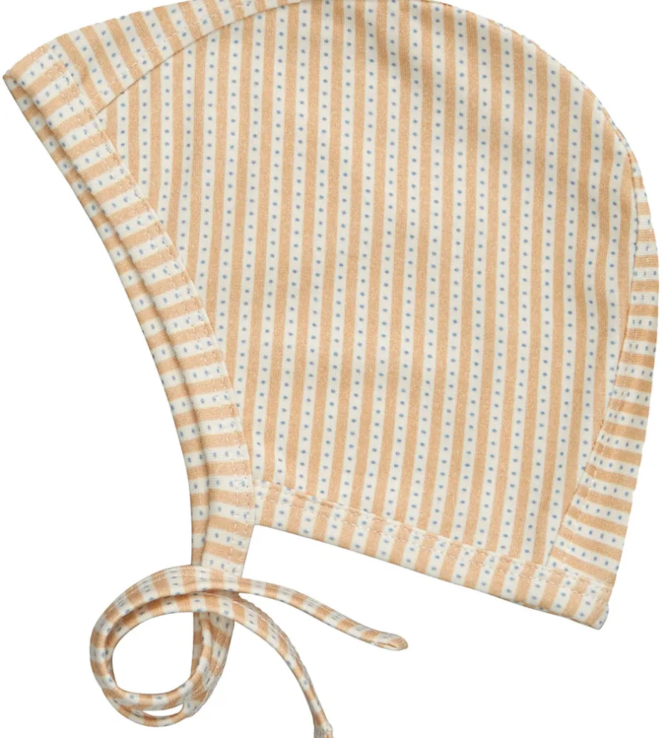 Sød Cam Cam Copenhagen babyhjelm med lysebrune og hvide striber samt lyseblå, små prikker.