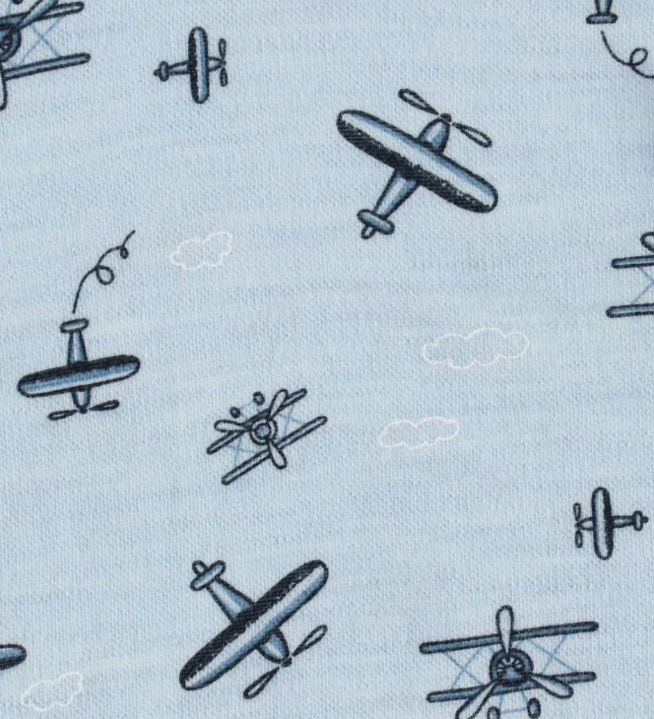 Charmerende Joha babyhjelm i en lyseblå nuance. Joha babyhjelmen er dekoreret med et fint print af små flyvemaskiner i mørkere blå toner, hvilket giver en legende detalje. Babyhjelmen har en rund facon med en kant af blød rib i en dybere blå nuance langs åbningen. Den lukkes med bindebånd, som giver mulighed for en justerbar pasform.