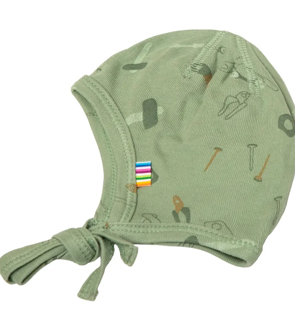 Sød Joha babyhjelm i støvet grøn med et flot værktøjsprint.