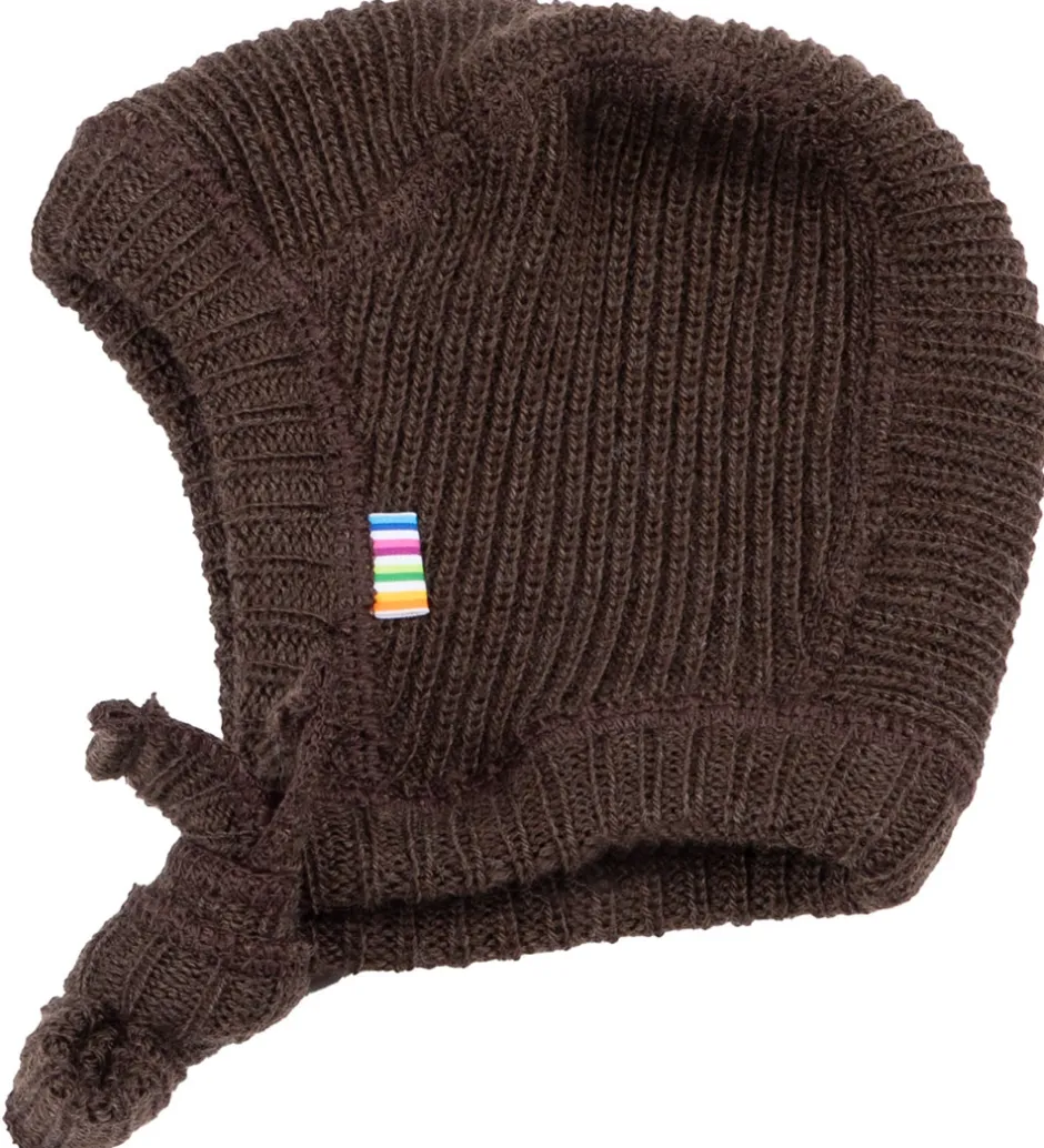 Praktisk Joha babyhjelm i en dyb mørkebrun farve. Hjelmen har fine detaljer og sikrer, at hovedet holdes varmt i køligt vejr.