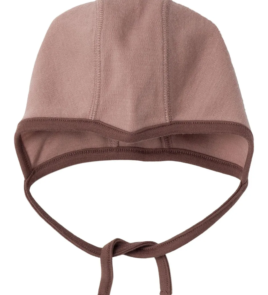 Sød Name It babyhjelm i støvet rosa, med støvet mørkerosa kanter og bindebånd.