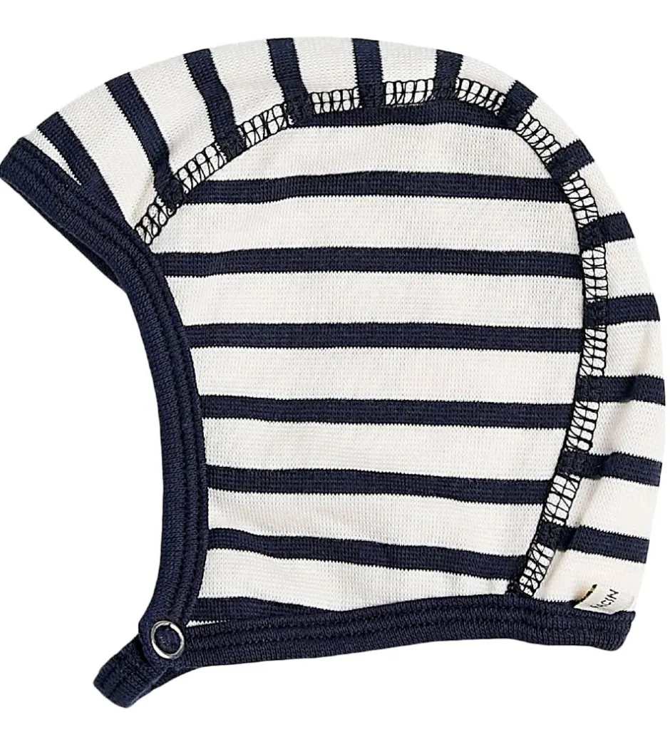 Skøn Racing Kids babyhjelm med vandrette striber i navy og hvid.