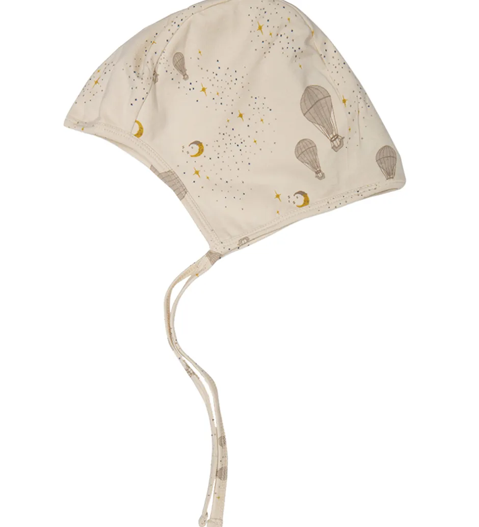 Sød That’s Mine babyhjelm i cremehvid med et alloverprint af luftballoner, måner og stjerner i beige og gule farver.