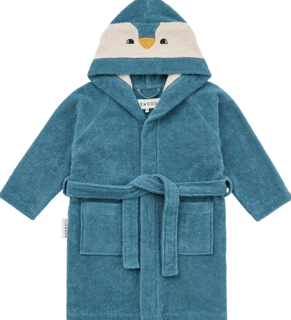 Sød Liewood badekåbe i blåt frotté med et pingvinhovede på hætten. Liewood badekåben har lange ærmer, en fast hætte og to praktiske lommer fortil. Badekåben lukkes fortil med skjulte trykknapper og et stofbælte.