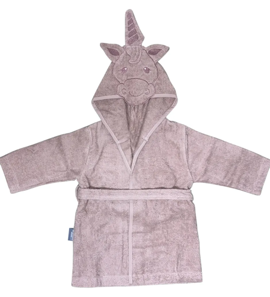 Lækker Nørgaard Madsens badekåbe i støvet rosa med en hætte i et enhjørningedesign med hørn, ører og broderede træk.