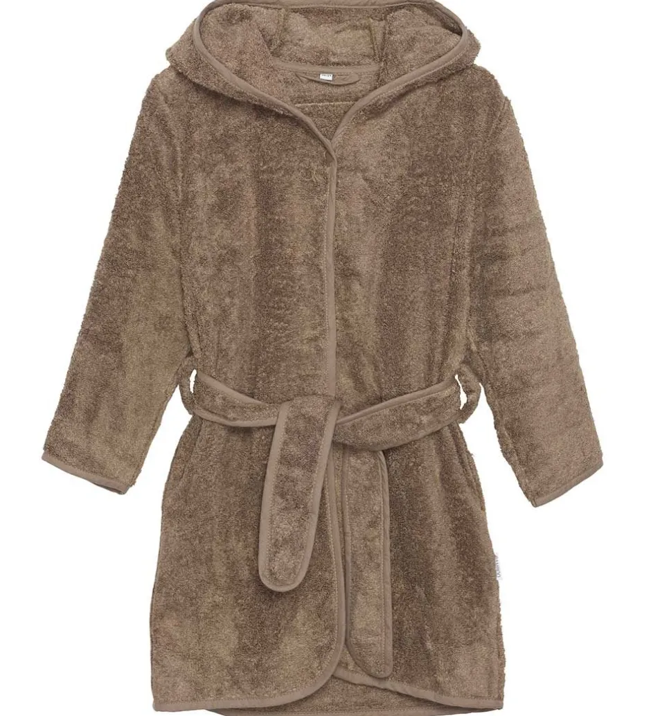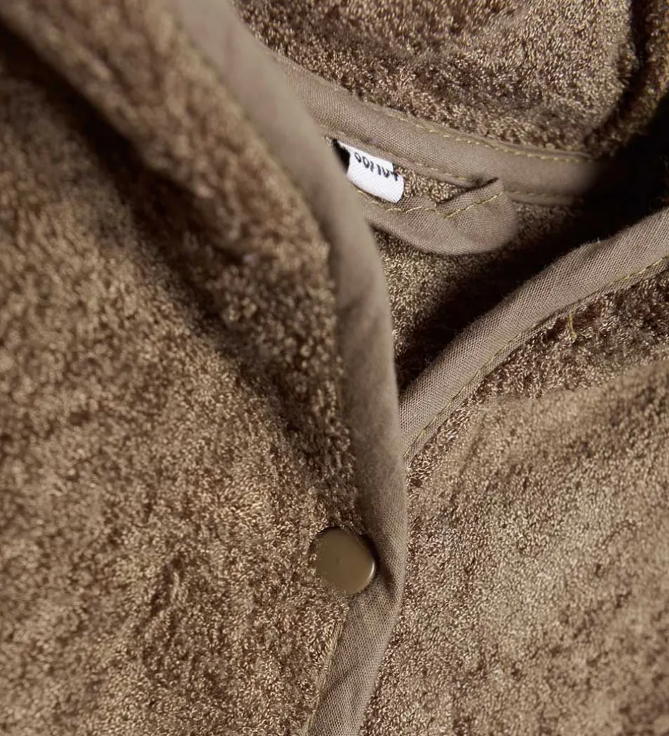 Pippi Baby badekåben har lange ærmer og bindes i livet med et bindebånd, der sidder fast i siderne. Fortil er der en trykknap, så den holdes lukket. Badekåben er lavet i en lækker, økologisk bomuldsfrotté, som føles blød mod huden.