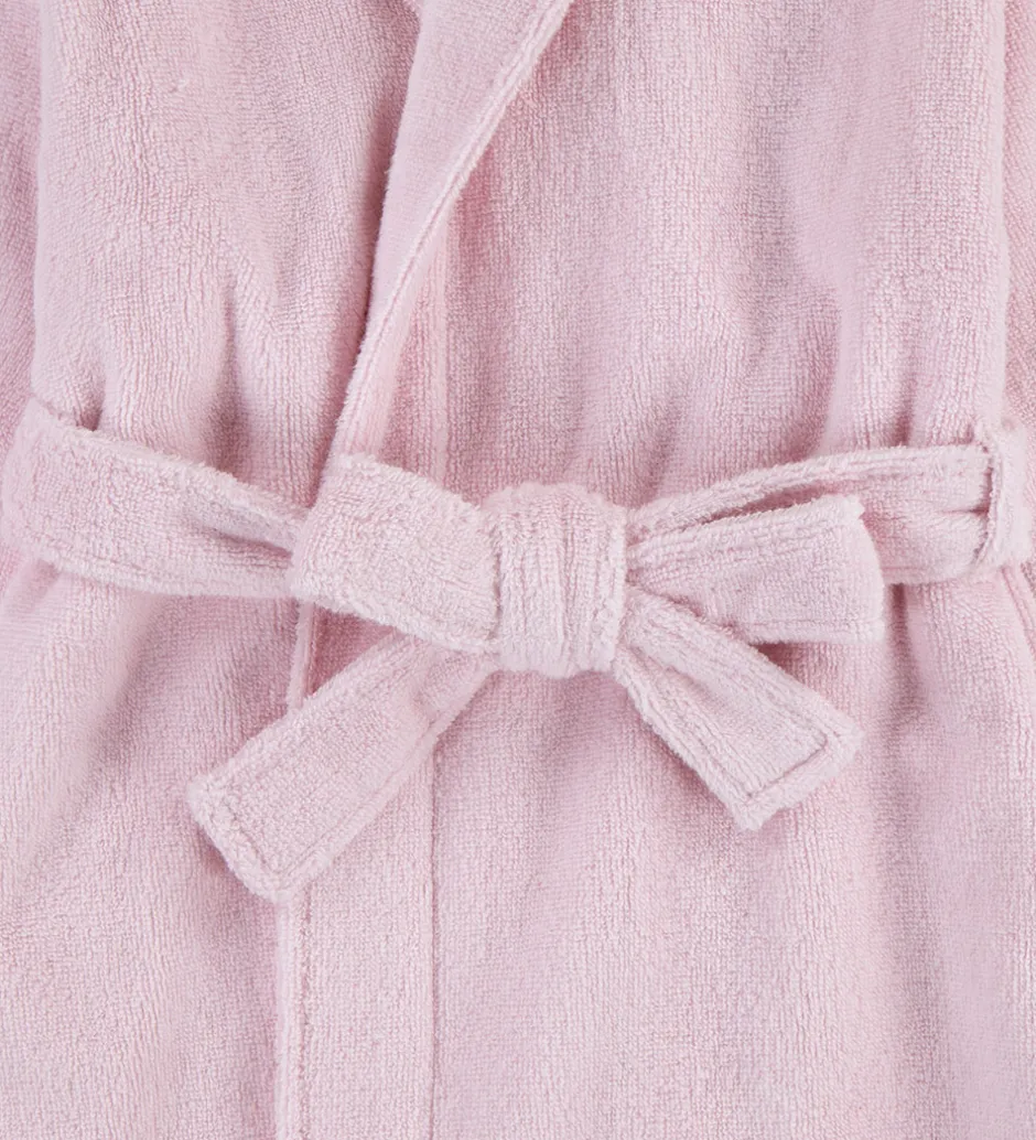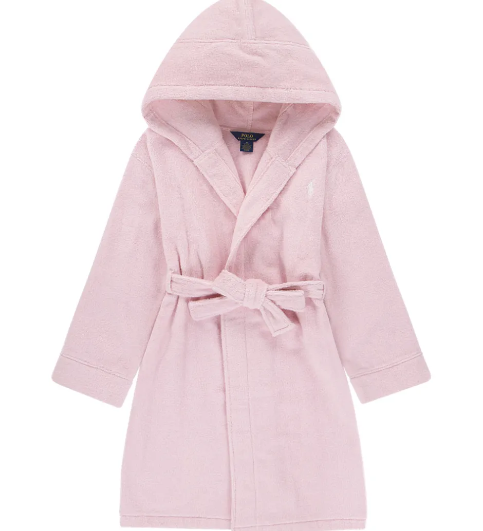 Flot Polo Ralph Lauren badekåbe i ensfarvet rosa frotté, og fortil i venstre side er der broderet et lille, hvidt logo.