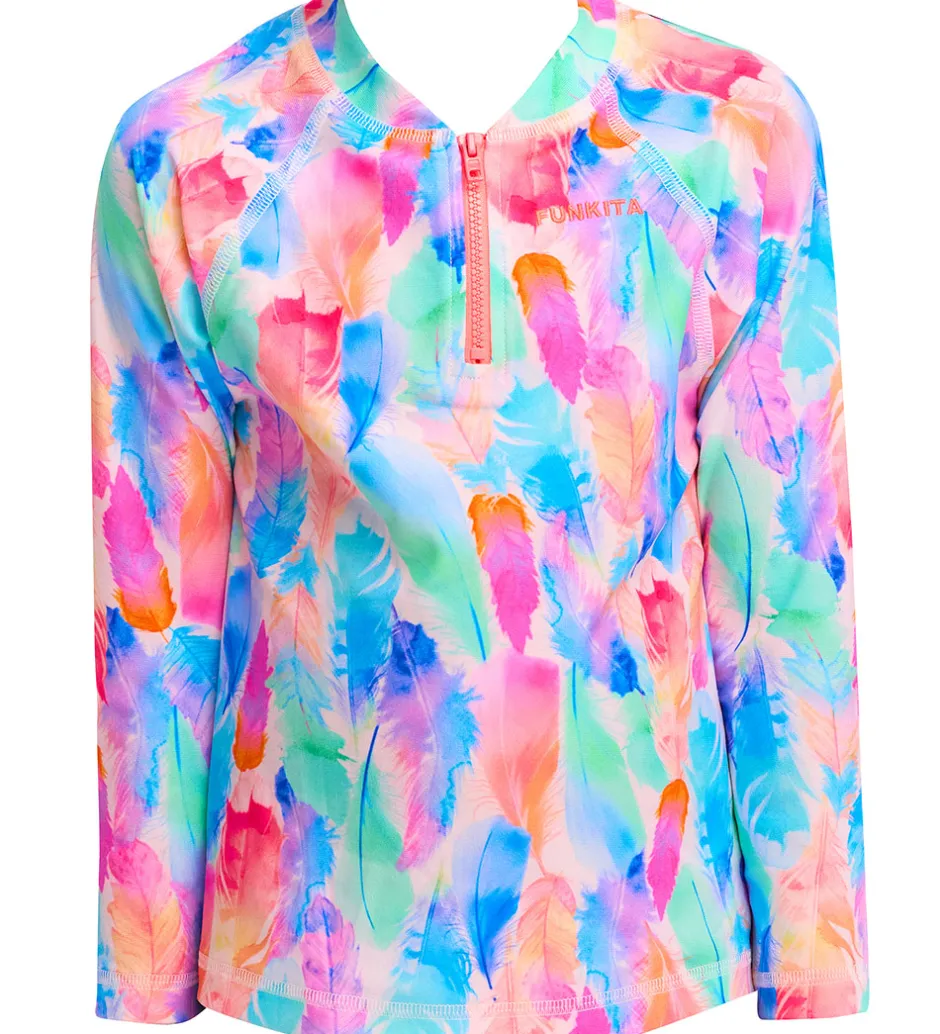Smart Funkita badebluse med et flot, multifarvet fjerprint.