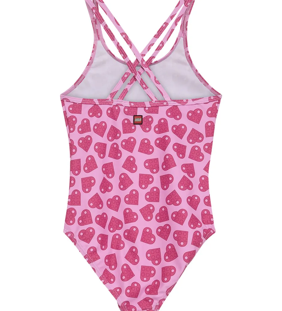 Flot LEGO® Wear badedragt i en lyserød nuance med et fint print af rosafarvet, LEGO® hjerter. Et charmerende design, der kombinerer farverigt legoklodsmønster med komfort og stil.