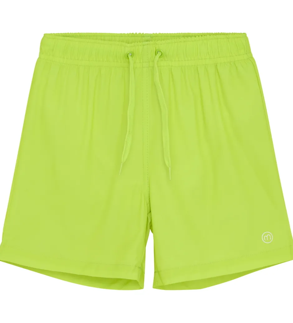 Funktionelle Minymo badeshorts i neongul, med et logo på venstre lår. Materialet er ensfarvet og glat, hvilket skaber et enkelt og stilrent udtryk.