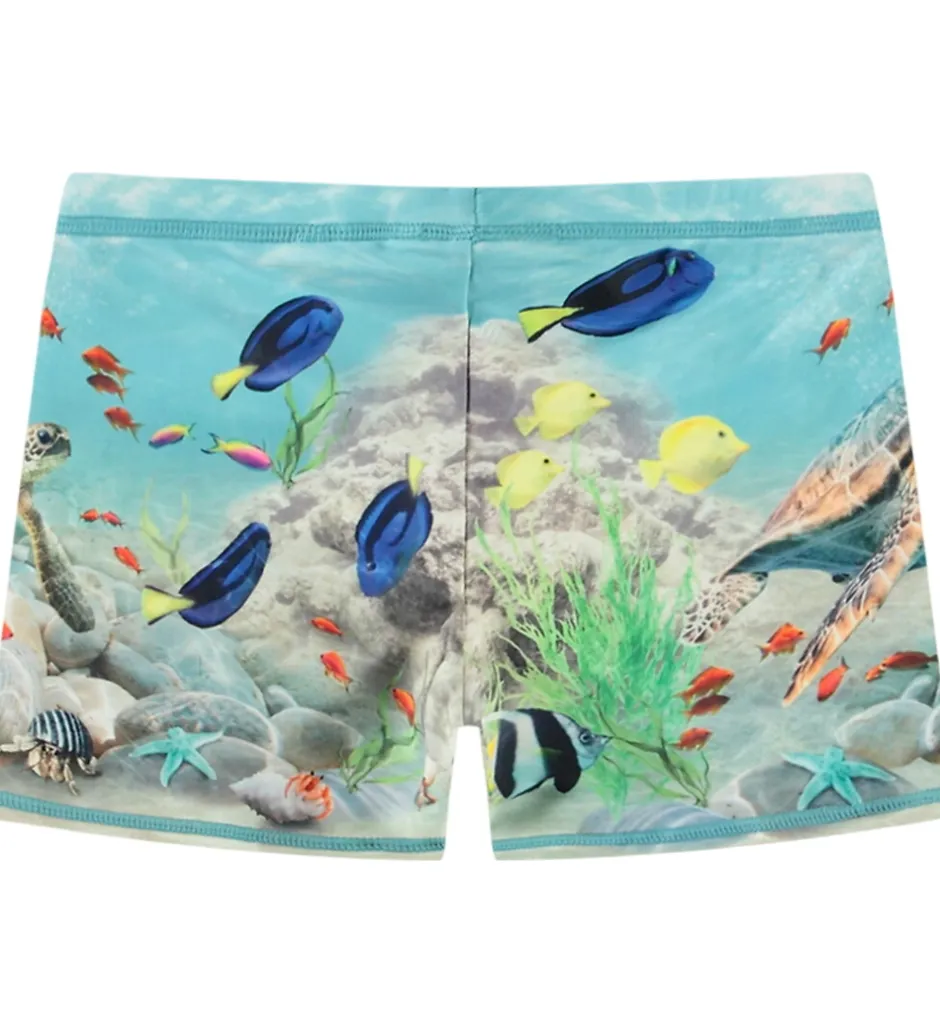 Farverige Molo badebukser med et undervandsprint af forskellige fisk og havskildpadder. Molo badebukserne har en elastisk talje, som kan justeres med snøre indvendigt.
