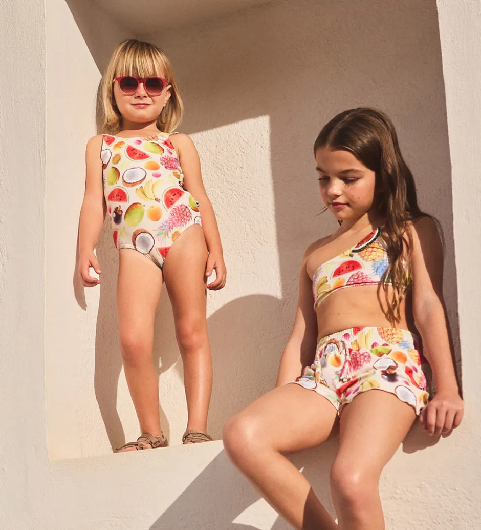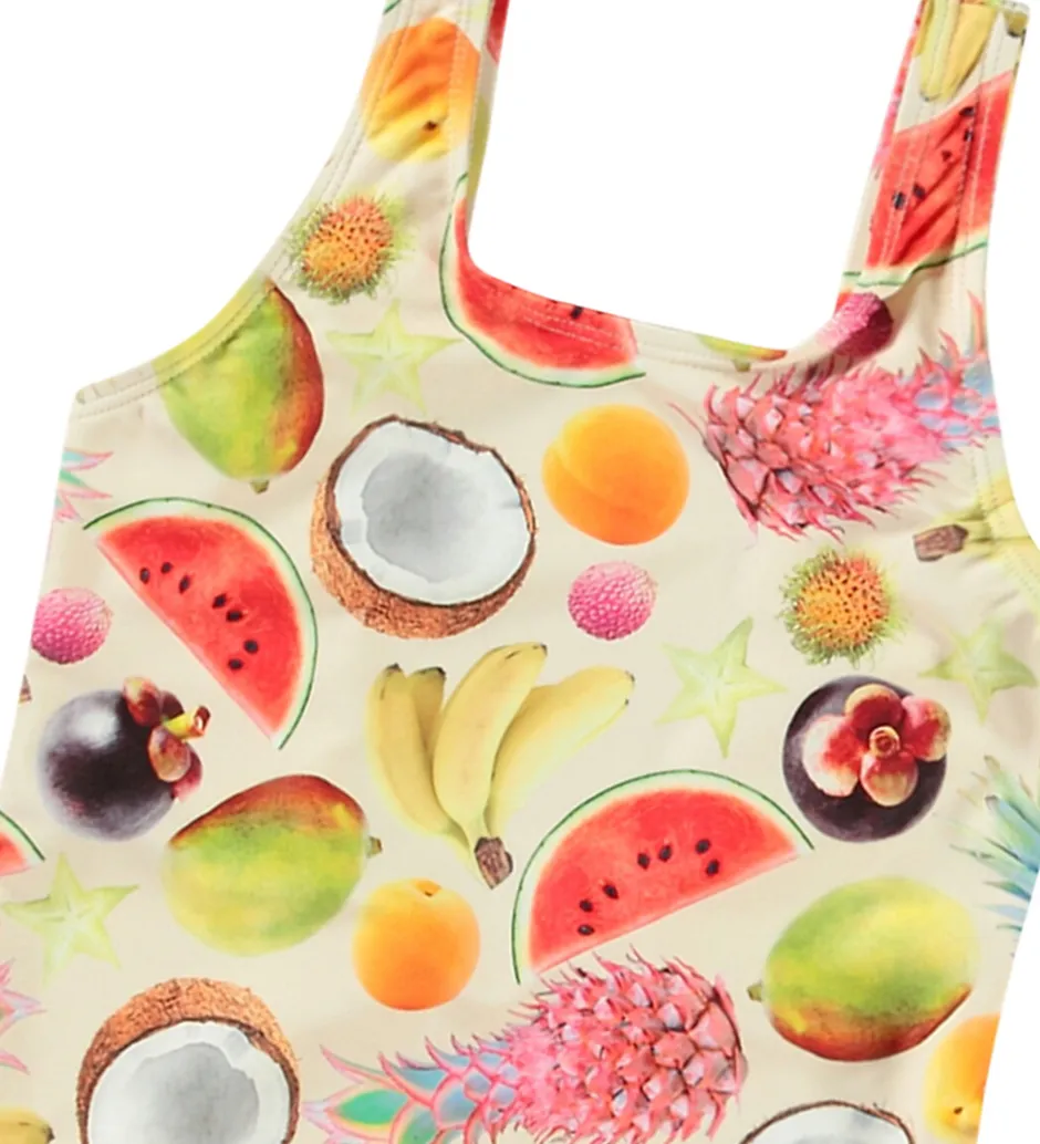 Molo badedragten har brede skulderstropper og en rund halsudskæring. Den har en dyb udskæring i ryggen og smalle elastikkanter i alle åbninger.