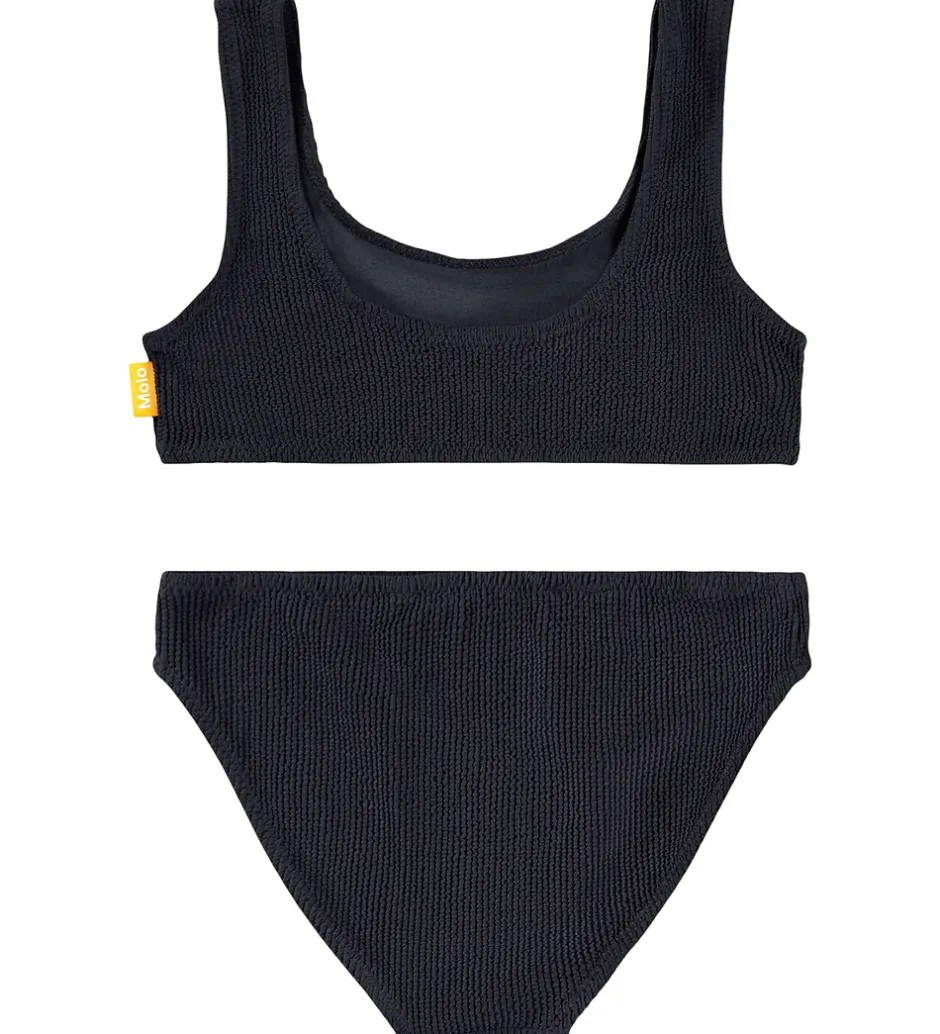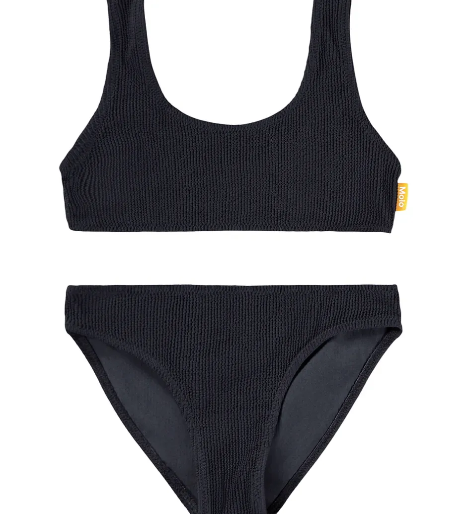 Elegant Molo bikini i en klassisk sort farve med flot struktur. Molo bikinioverdelen har brede stropper og en behagelig, tætsiddende pasform. Bikinien har elastiske kanter ved alle åbninger, som giver en god pasform. Bikinien har et praktisk UV-filter på 50+.
