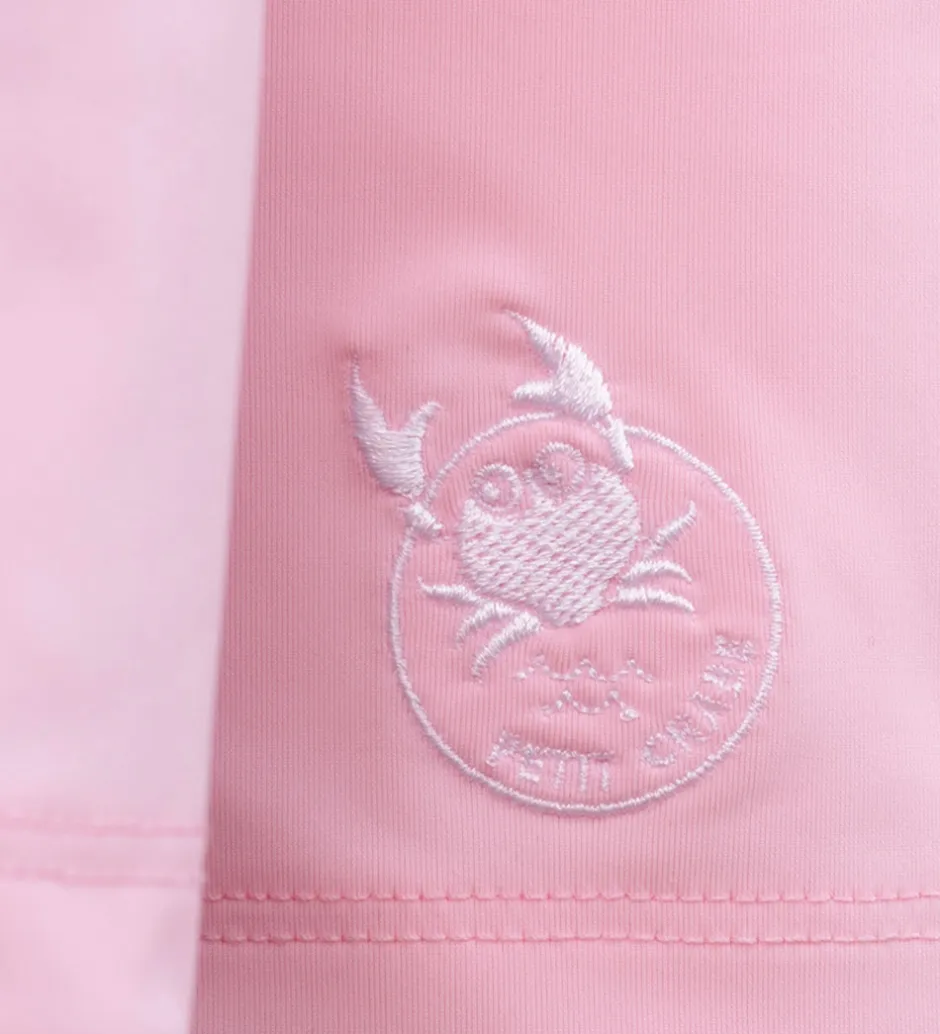 Lækker Petit Crabe badebluse i en lys rosa med et broderet logo nederst. Badeblusen har lange ærmer med flæser henover skuldrene, samt en høj hals.