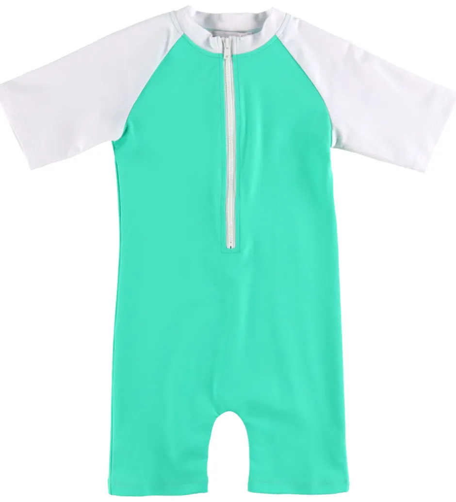 Flot Petit Crabe badeheldragt i en skarp lysegrøn farve med kontrasterende hvide ærmer. Perfekt til en dag på stranden.