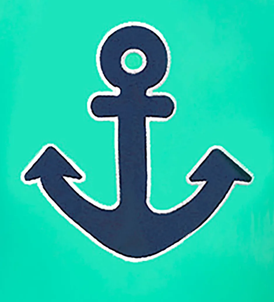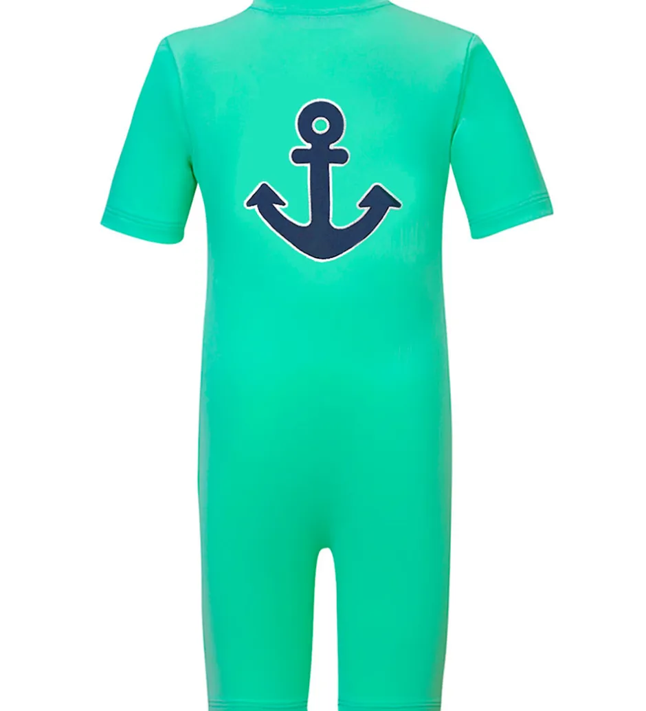 Smart Petit Crabe badeheldragt i en frisk grøn med et stort anker på ryggen.