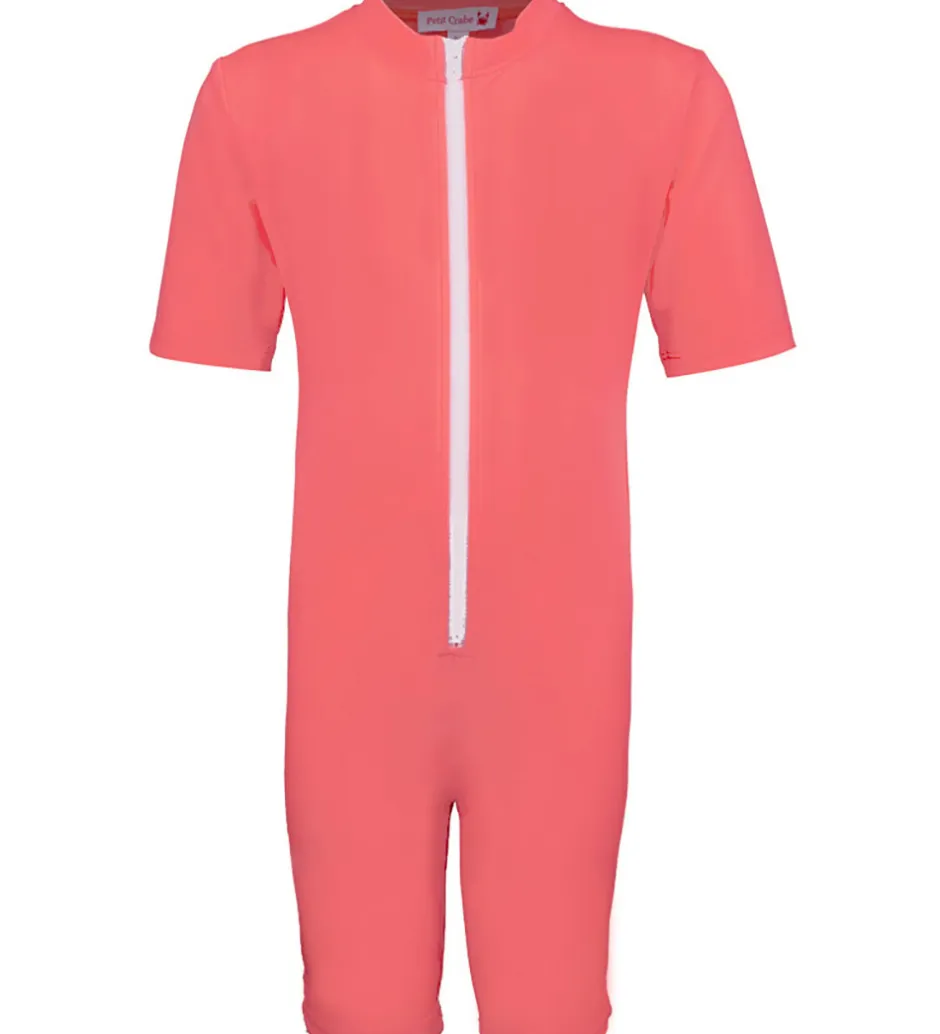 Petit Crabe badeheldragten har korte ærmer og ben, samt en høj hals. Dragten åbnes på fronten med en lynlås, med indvendig vindstolpe, så den ikke generer huden.