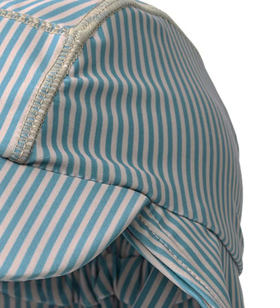 Wheat badehatten er designet som en legionærhat med ekstra beskyttelse til nakken. Pasformen er optimeret med elastik bagpå, hvilket sikrer, at badehatten sidder godt på hovedet under brug.