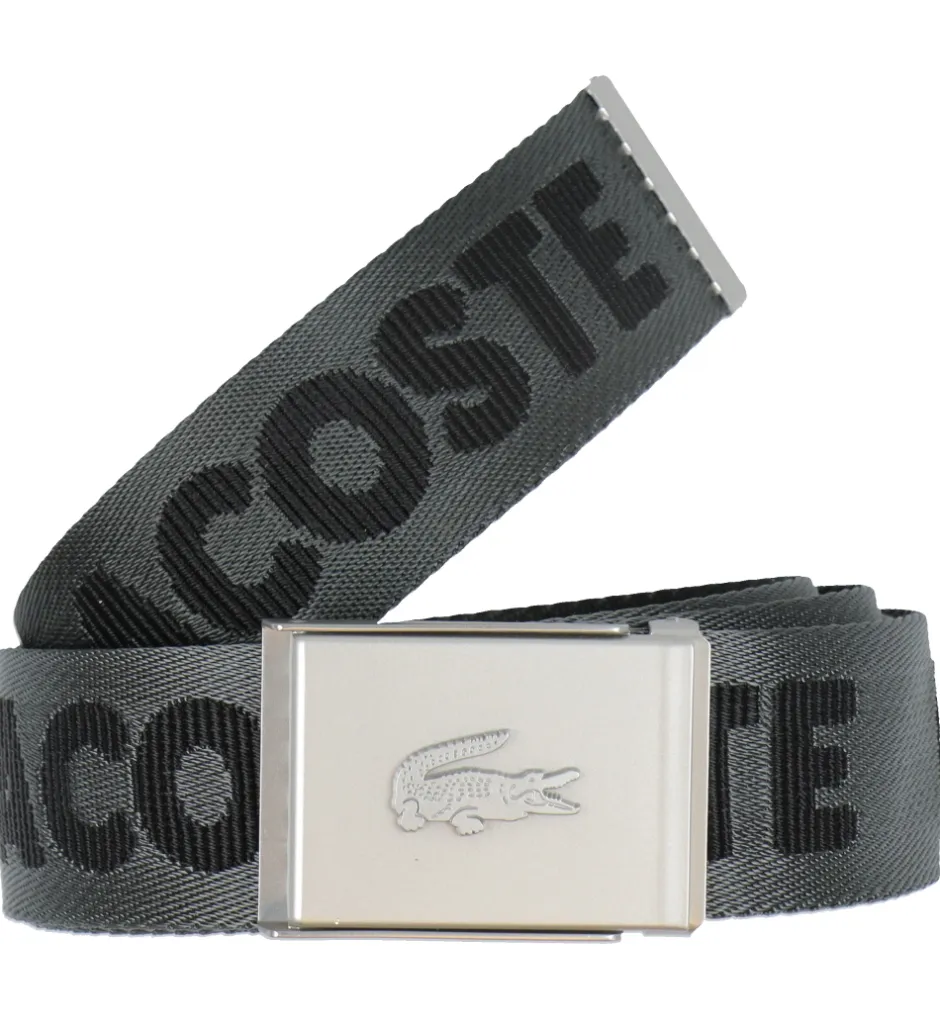 Lækkert Lacoste bælte i en flot mørkegrå nuance med et stort logoprint i sort på hele bæltet.