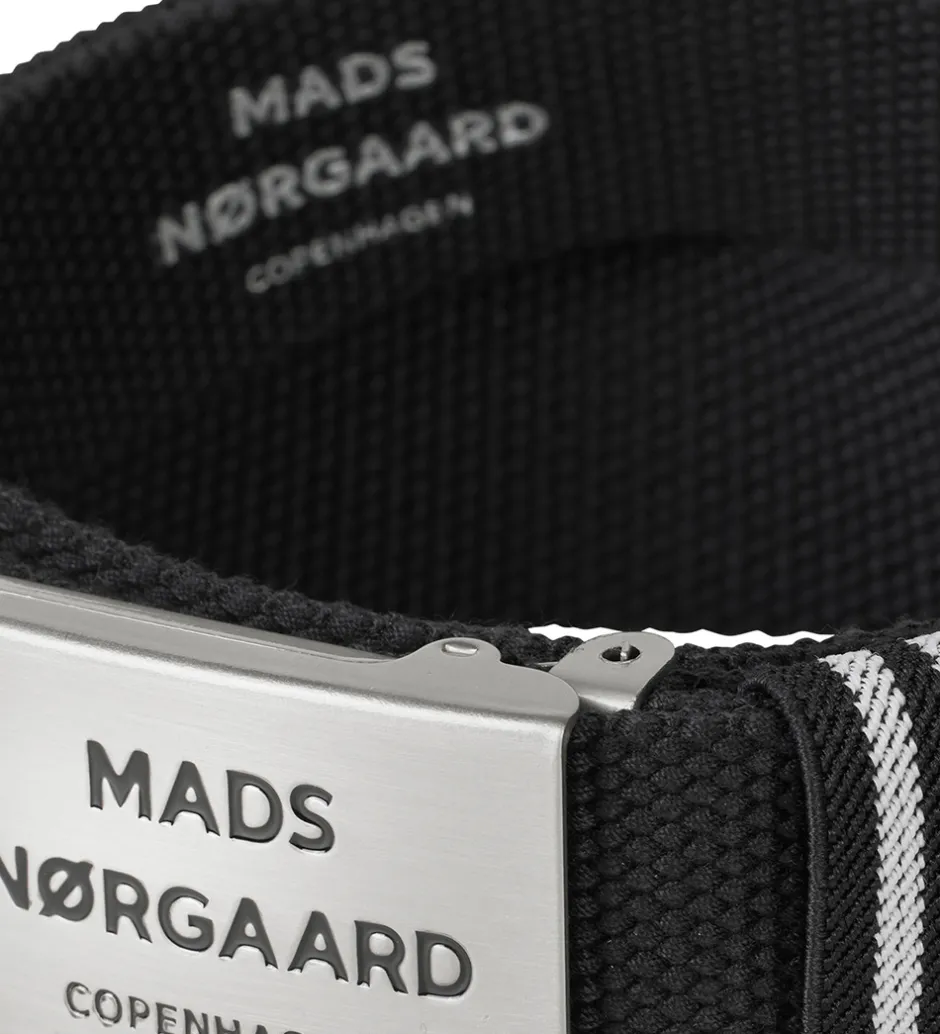 Sejt Mads Nørgaard bælte i sort med en hvid og sort stribet rem. Bæltespændet er i metal med et sort logo.