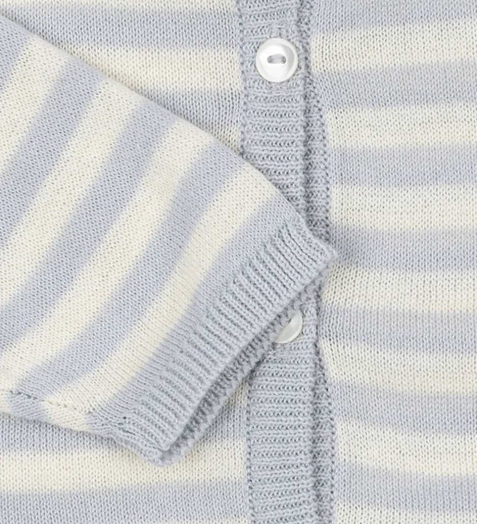 Vidunderlig cardigan fra Fanga Fontana strikket i et klassisk stribemønster i bløde nuancer af lyseblå og cremehvid.
