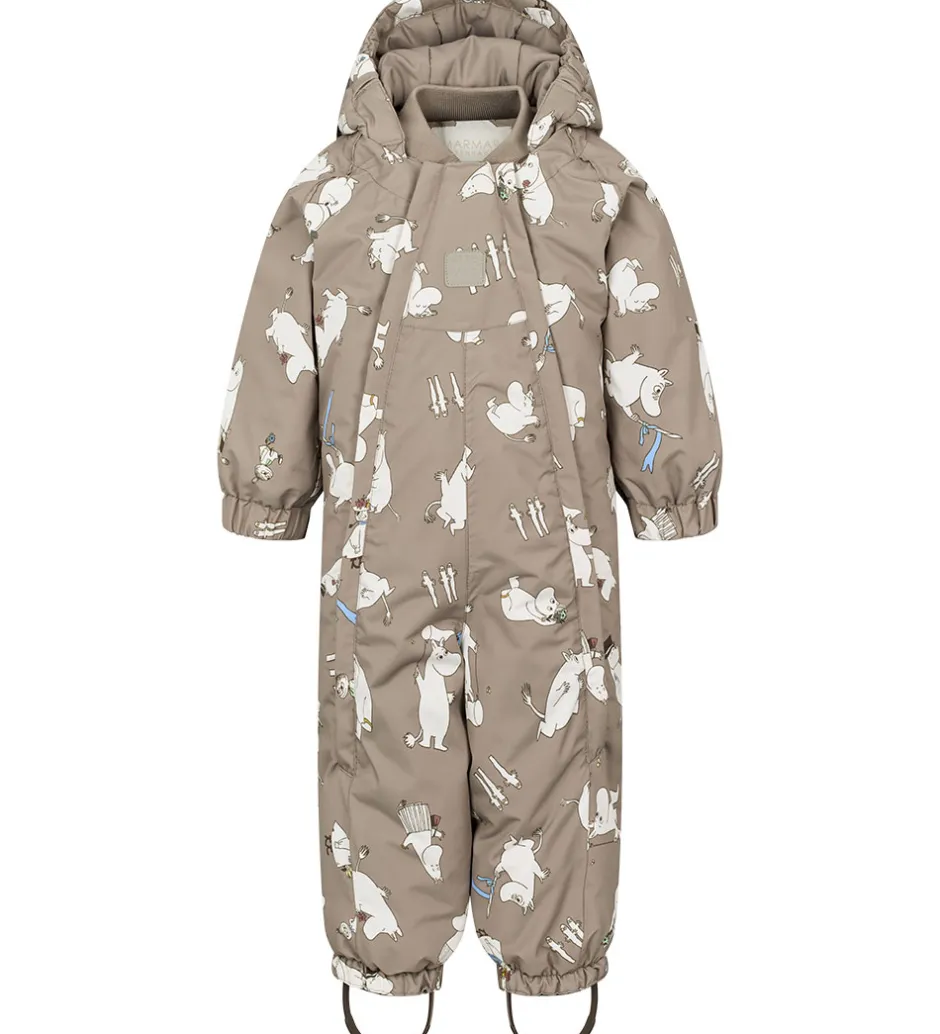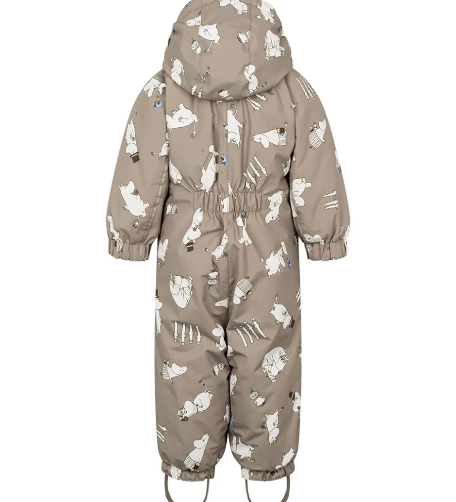 Sød MarMar flyverdragt i grågrøn med et alloverprint af motiver fra Mumitroldene. Flyverdragten har praktiske refleksdetaljer.