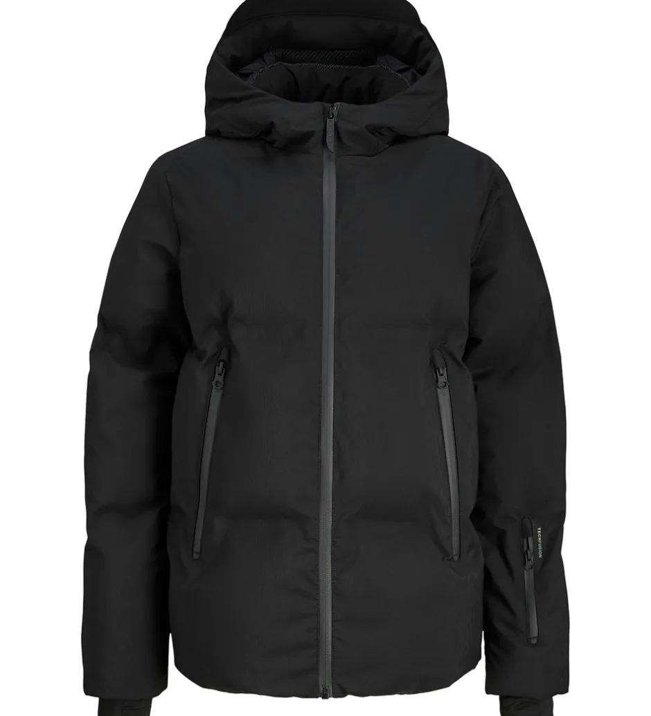 Flot Jack & Jones vinterjakke i sort. Vinterjakken har en fastsyet hætte med mesh indvendigt og en praktisk skygge. Langs kraven er der fint fleece, og vinterjakken lukkes med en gennemgående lynlås med indvendig vindstolpe og hagebeskytter. I ærmeåbningerne er der snefang med hul til tommelfingrene. Fortil er der en lynlåslomme i begge sider med fleecefor indvendigt, og nederst på venstre ærme er der yderligere en lynlåslomme.