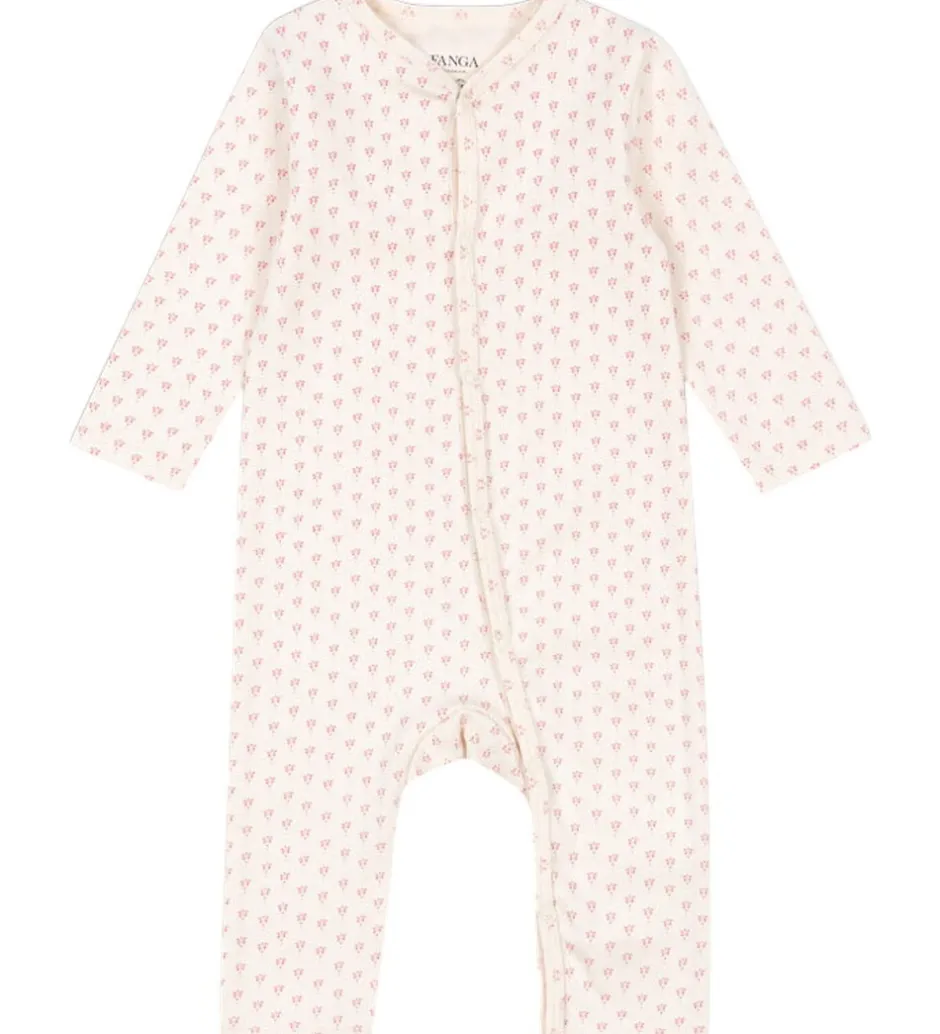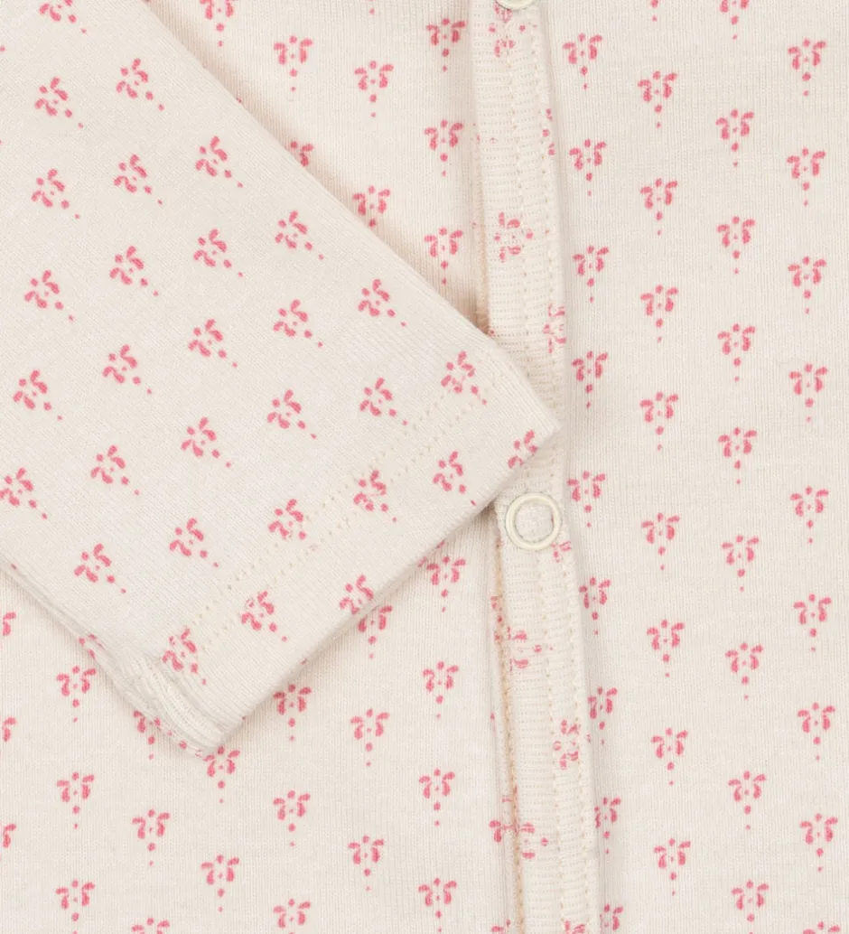 Charmerende Fanga Fontana natdragt med lange ærmer i en blød, cremehvid nuance. Natdragten har et diskret mønster af små, lyserøde motiver. Den er udstyret med trykknapper langs fronten og mellem benene for nem åbning.