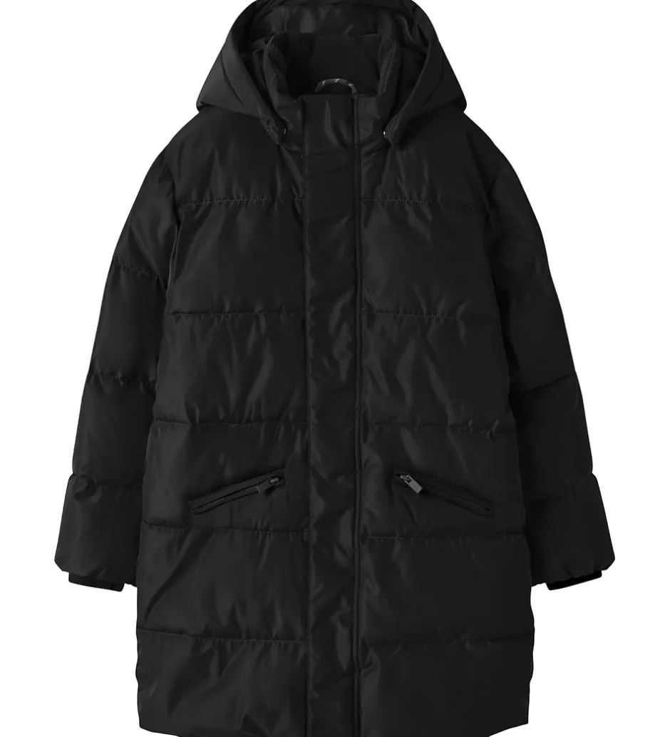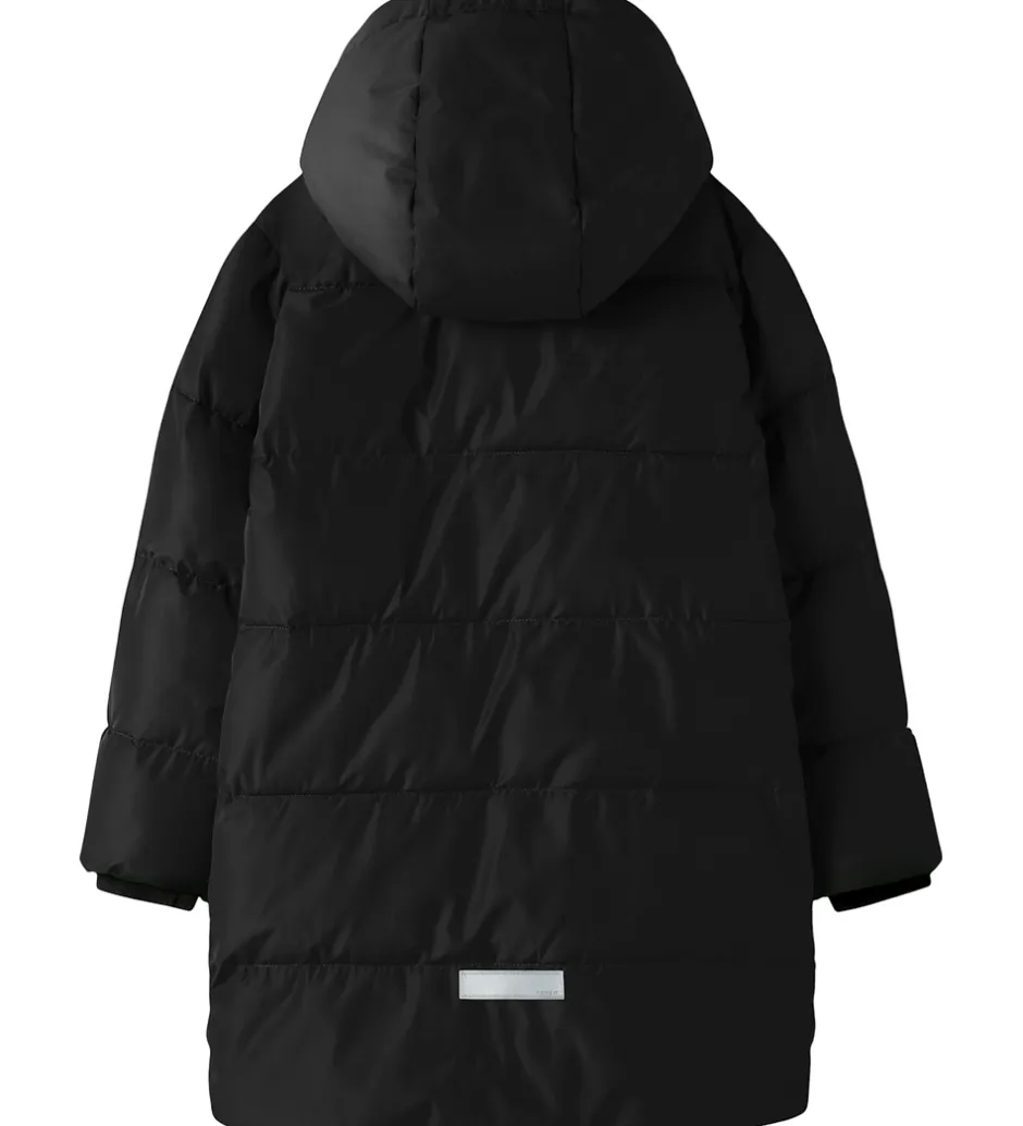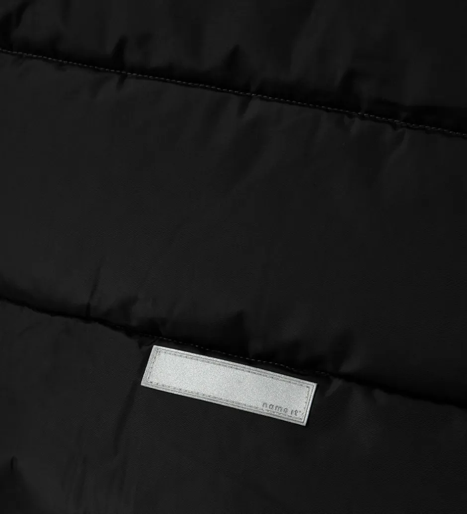 Flot Name It dynefrakke i ensfarvet sort og med vandrette syninger samt praktiske reflekser.