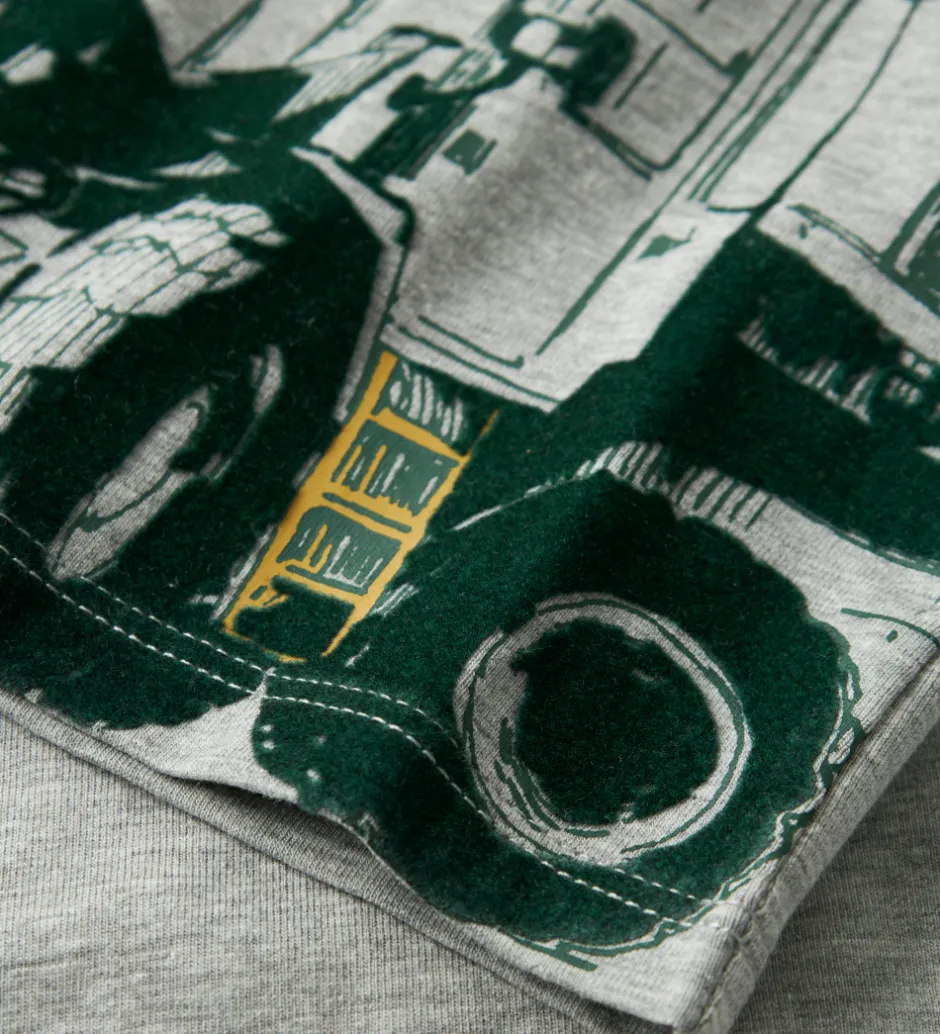Flot Name It bluse med lange ærmer i gråmeleret. Blusen har en rund halsudskæring og et print foran med store maskiner og teksten “Strong” i mørkegrøn.