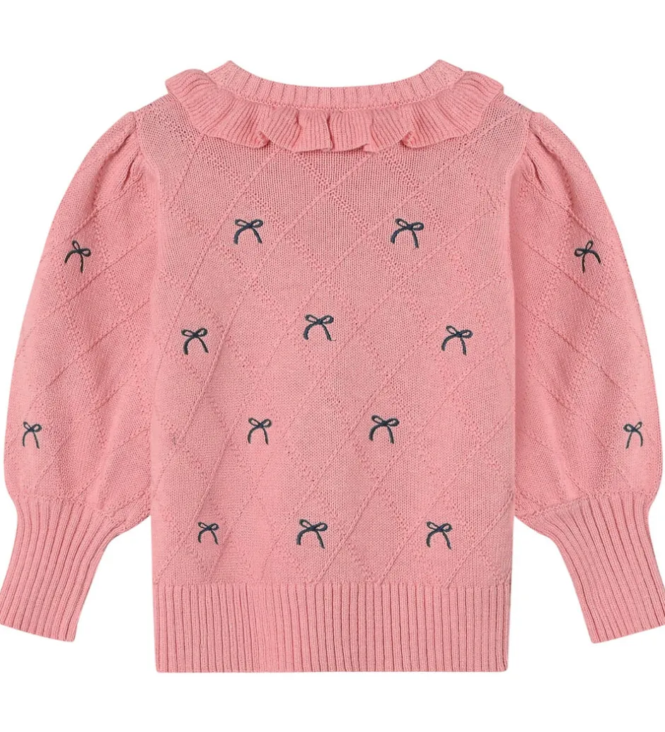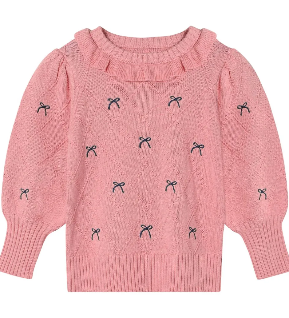 Charmerende Fliink bluse rosa med broderede sløjfer i mørkeblå. Blusen har strikket struktur med firkantet mønster. Den har en rund halsudskæring med flæsekant og lange ballonærmer. I ærme- og taljeåbning er der brede ribkanter.