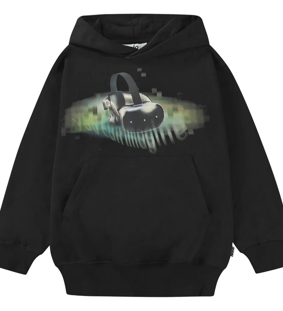 Stilren Molo hættetrøje i klassisk sort med et virtuelt print på fronten. Molo hættetrøjen har en praktisk kængurulomme og lange ærmer med brede ribkanter. Hættetrøjen har en behagelig hætte, der fuldender det moderne look. Elastik i livet sikrer en god pasform.