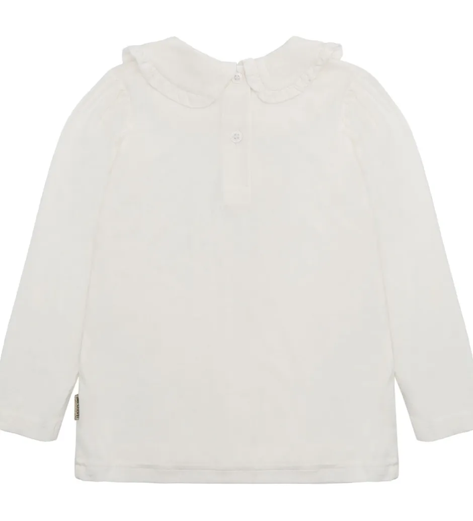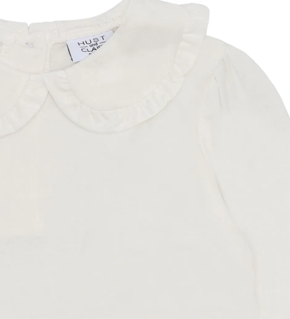 Elegant bluse fra Hust and Claire i en enkel hvid farve. Blusen har lange ærmer og en rund halsudskæring med fine flæsedetaljer langs kanten af kraven. Hust and Claire blusen lukkes i nakken med knapper.