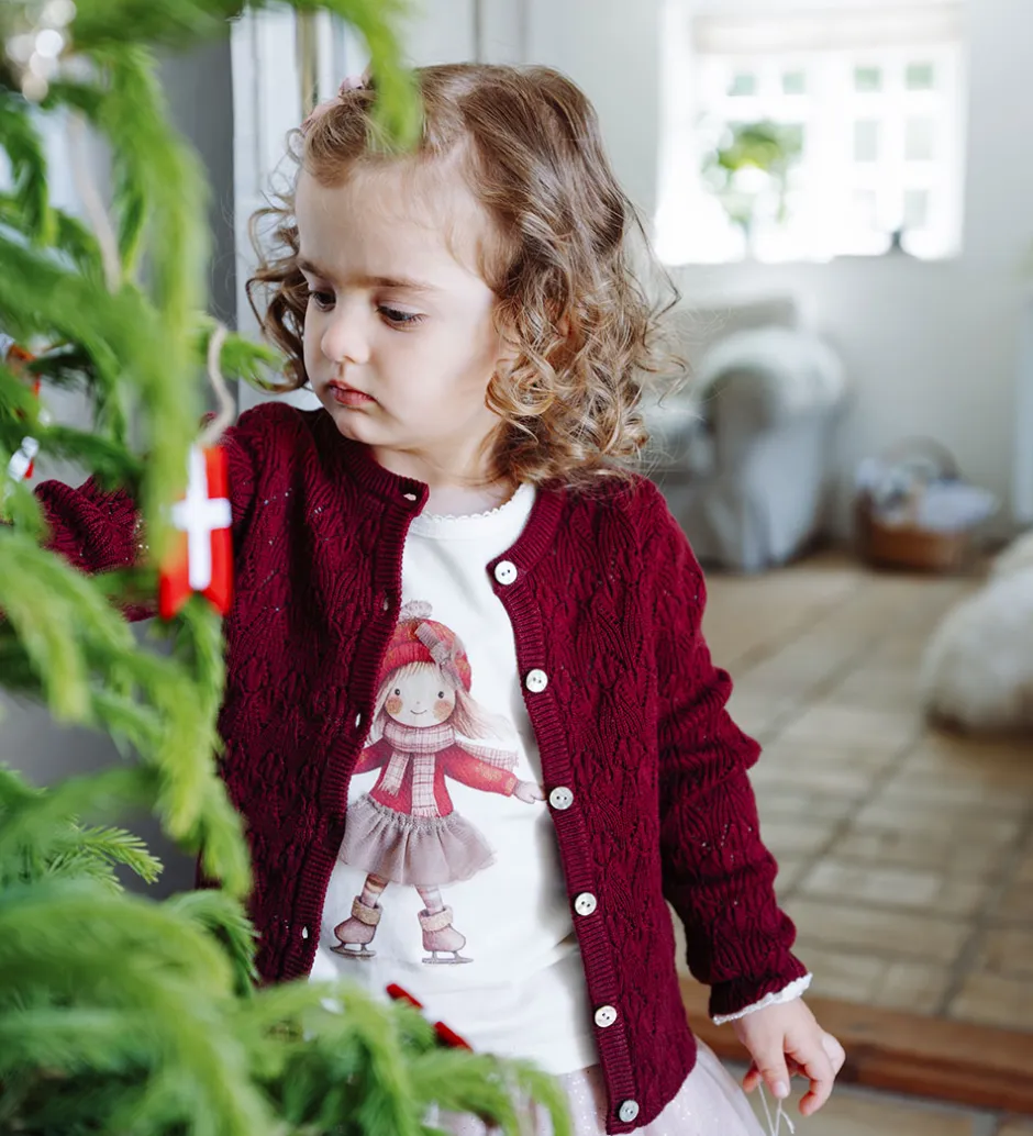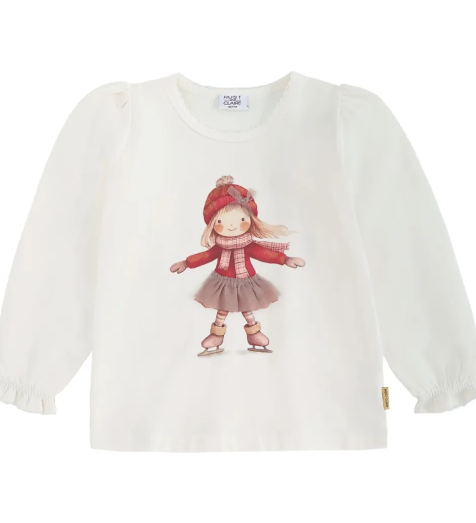 Charmerende Hust and Claire bluse i hvid med et motiv af en pige på skøjter, og hendes nederdel er dekoreret med tyl. Blusen har lange ærmer og en rund halsudskæring. De let puffede ærmer afsluttes med elastiske kanter, der skaber en diskret rynkeeffekt.