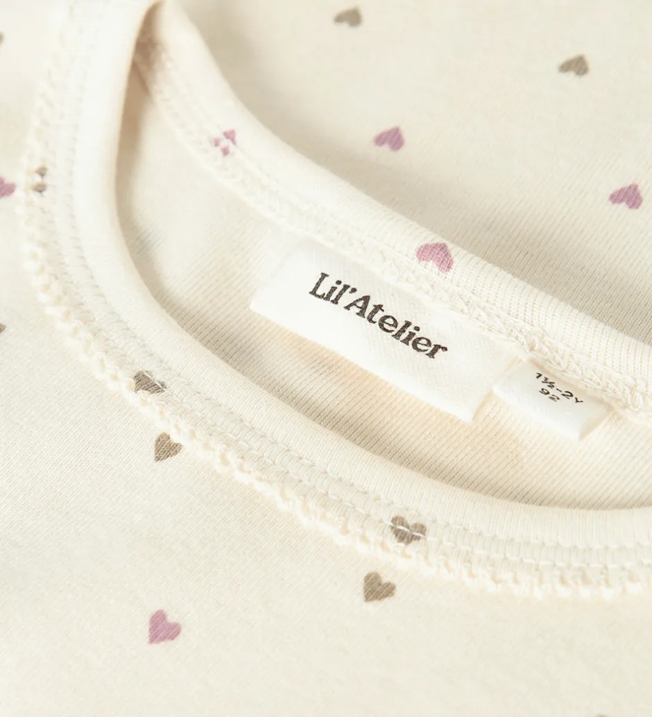 Fin bluse fra Lil Atelier i lys beige med et alloverprint af små hjerter i rosa og grøn. Blusen har en rund halsudskæring med en dekorativ kant og lange ærmer. Den er fremstillet i en meget blød kvalitet.