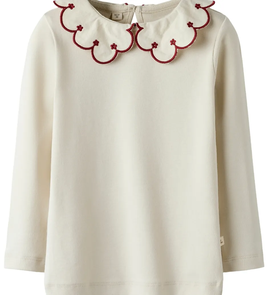 Fin Lil Atelier bluse i lys beige. Blusen har lange ærmer og en rund halsudskæring, som prydes af en dekorativ krave med små broderede blomster samt bølgede kanter i rød. Blusen er fremstillet i en meget blød kvalitet.