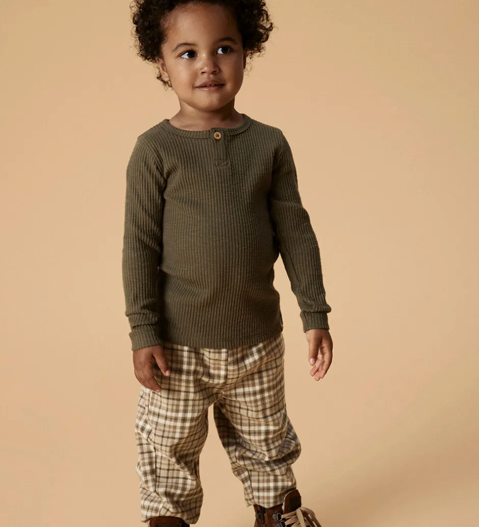 Flot Lil Atelier bluse i støvet mørkegrøn med ribstruktur. Blusen har en rund halsudskæring med en knap foran og lange ærmer. Blusen har en blød, let børstet overflade.