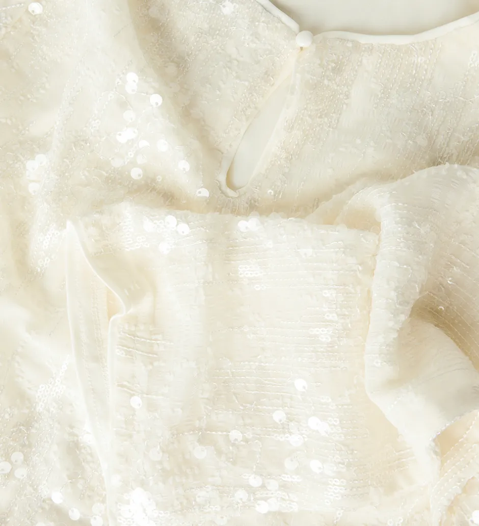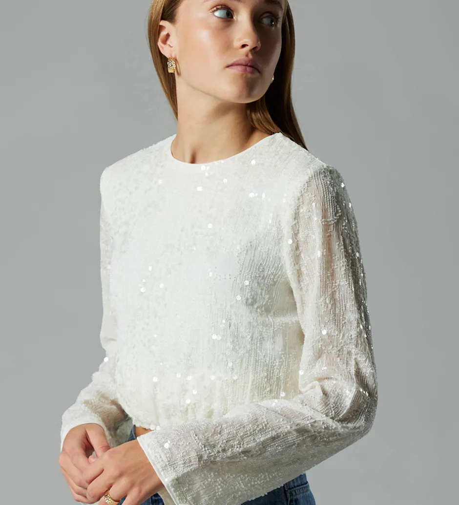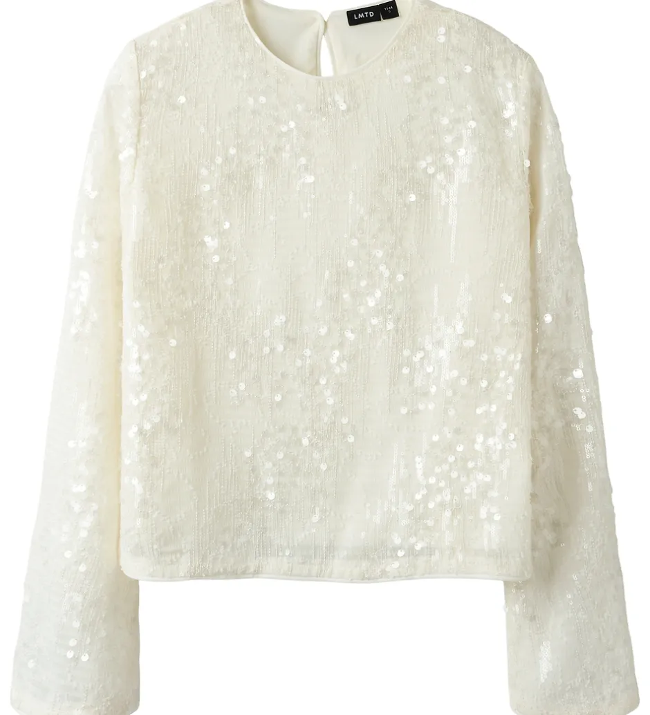 Elegant LMTD bluse i hvid med fin struktur og små pailletter, der giver en skinnende effekt. Blusen har en rund halsudskæring med en knap i nakken og lange ærmer med god vidde ved håndleddene. Ærmerne er semitransparente, mens der i kroppen er et ekstra lag stof, som gør at blusen ikke er gennemsigtig.