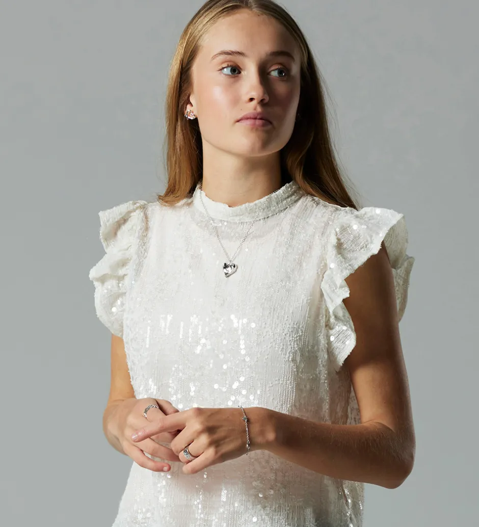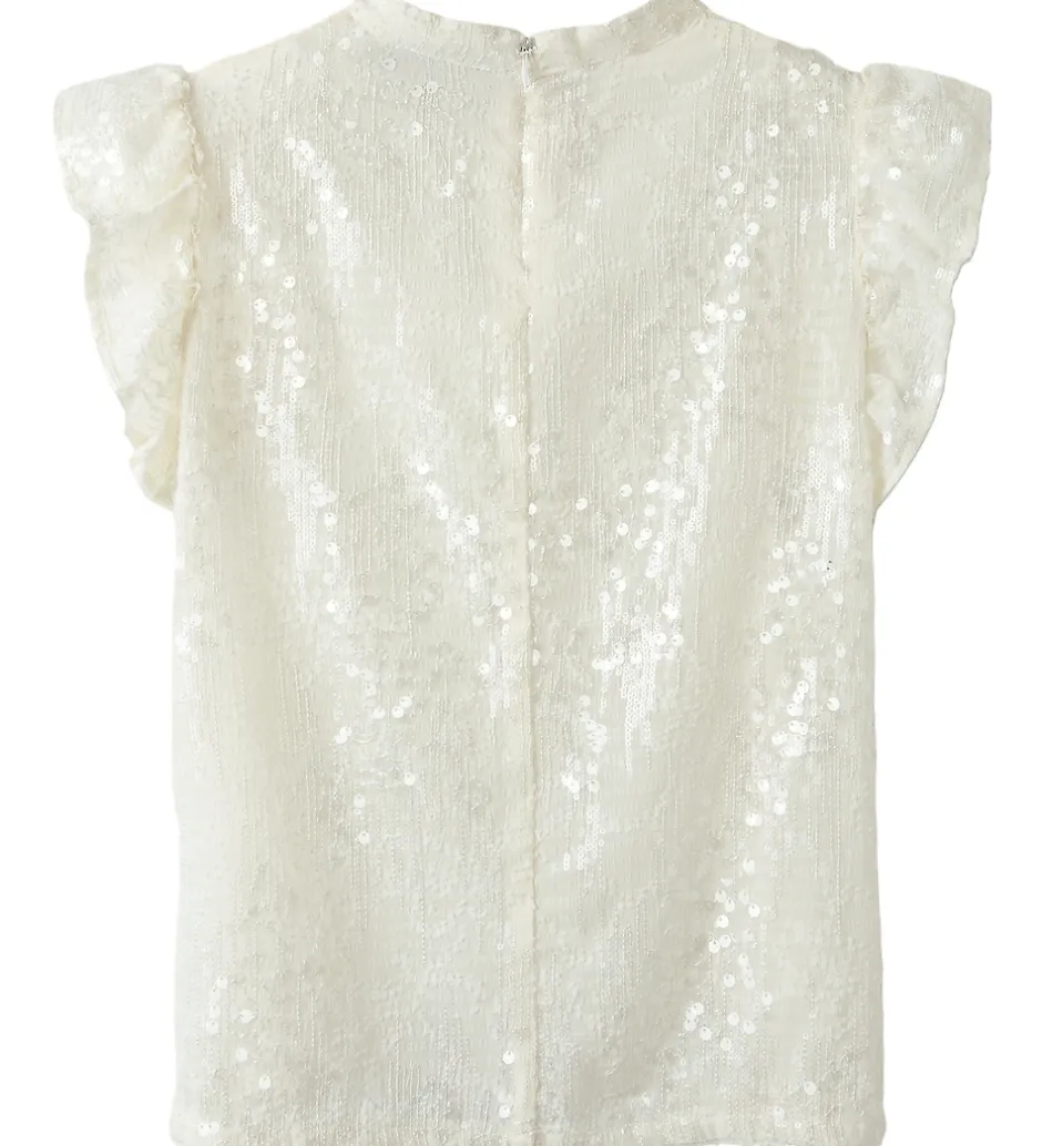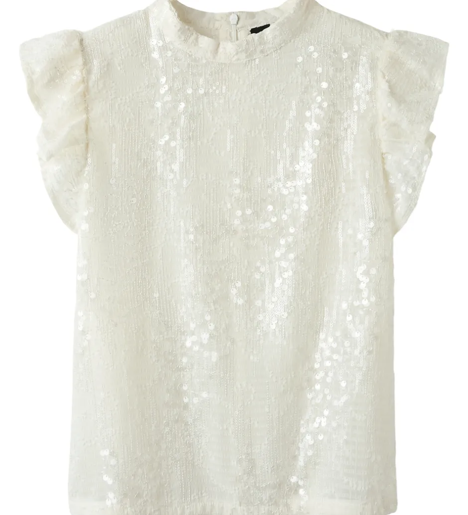 Elegant LMTD bluse i hvid med broderidetaljer og transparente palietter. Blusen har en rund halsudskæring med en knap i nakken. Den har korte flæseærmer og en løs pasform.