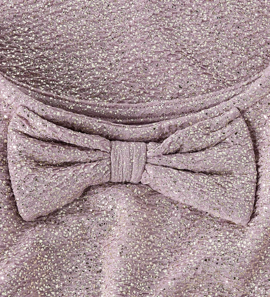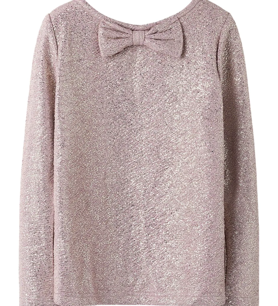 Elegant Name It bluse i rosa med guld prikker. Blusen har en rund halsudskæring og lange ærmer. I nakken er der en stor sløjfe.