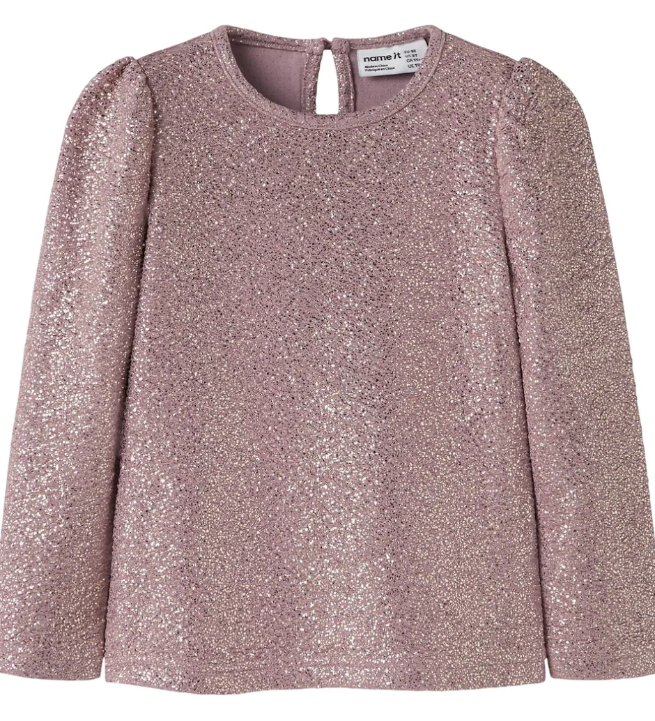 Skinnende Name It bluse i rosa med glimmer. Blusen har en rund halsudskæring med en knap i nakken. Den har lange ærmer med puf ved skuldrene.