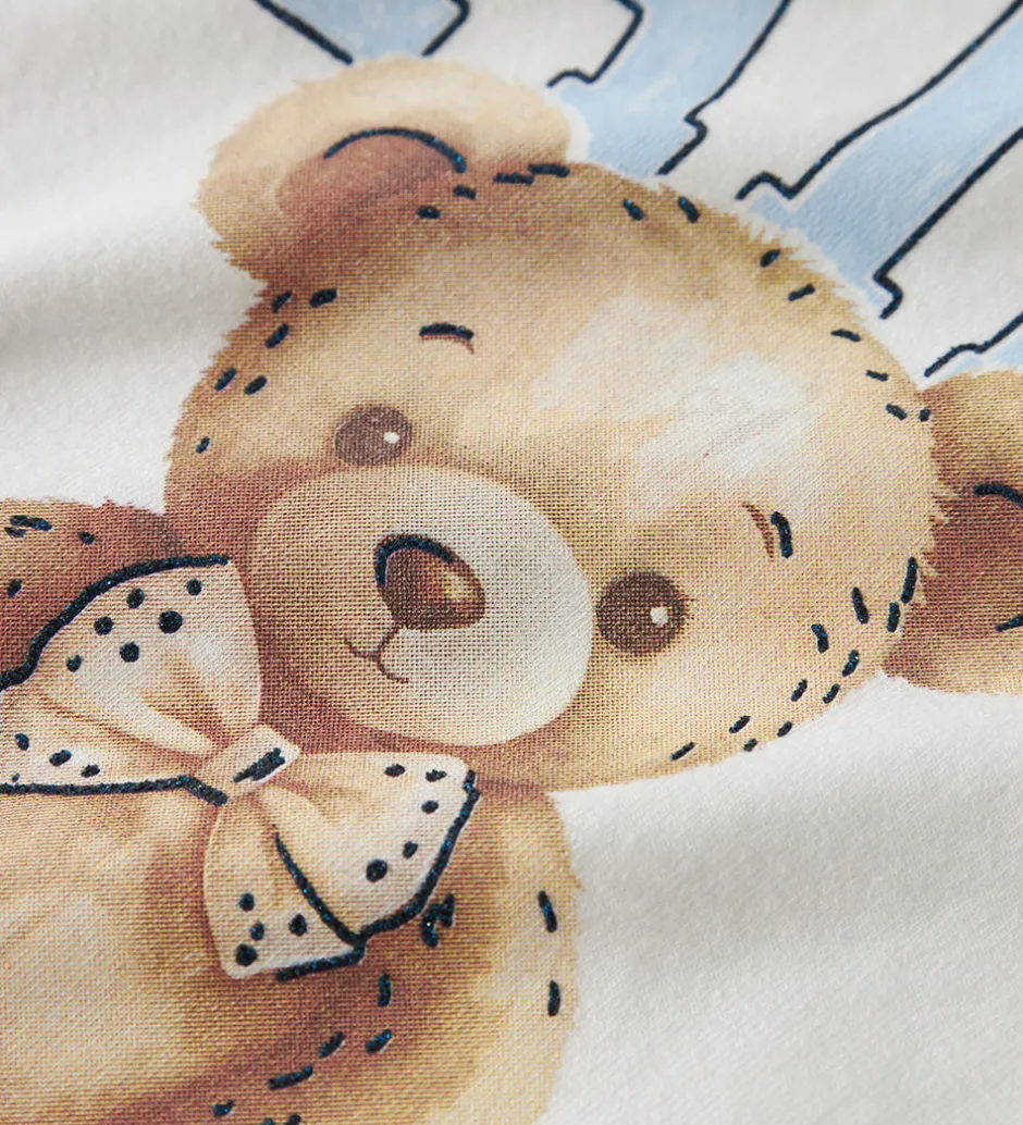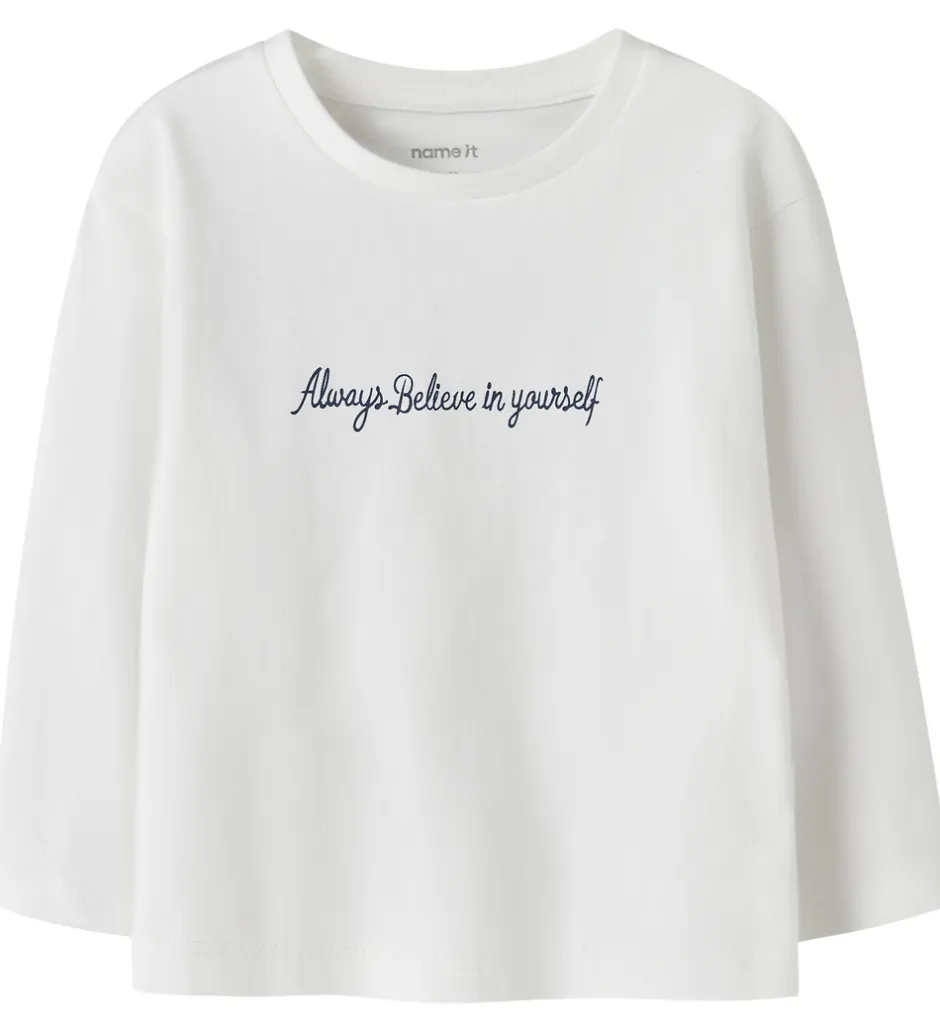 Smart Name It bluse med lange ærmer i hvid. På fronten er der navyblå print med teksten “Always Believe in Yourself”. På ryggen er der et stort print af en brun bamse og teksten “Paris” i lyseblå med glimmerdetaljer. Blusen har en rund halsudskæring med en smal ribkant.