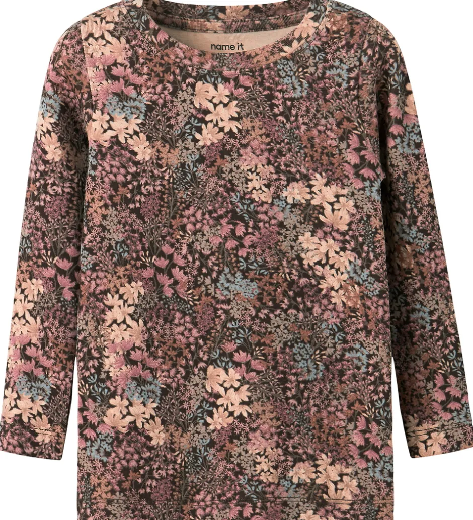 Smart Name It bluse i mørkebrun med et alloverprint af blomster i primært rosa og lilla nuancer. Blusen har en rund halsudskæring og lange ærmer.