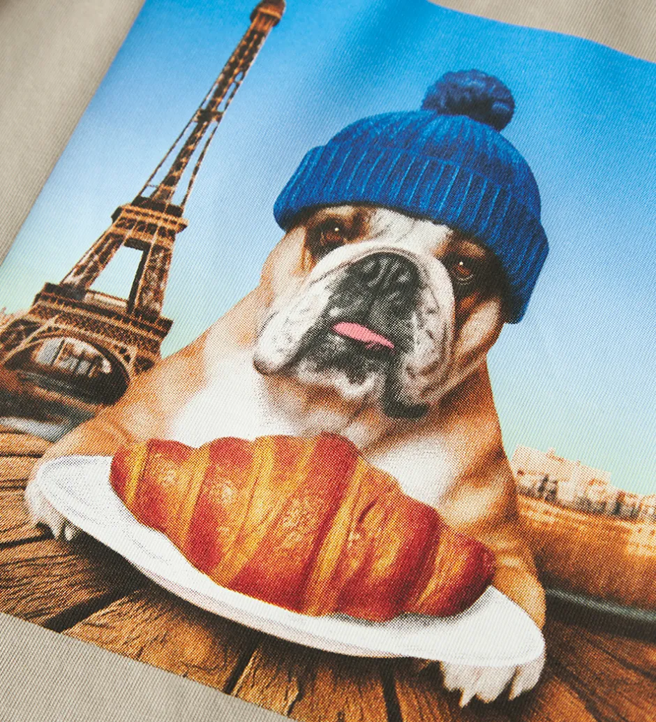 Charmerende Name It bluse i beige med et print med en bulldog iført en blå hue, en crossaint og Eiffeltårnet. Blusen har en rund halsudskæring med en smal ribkant og lange ærmer.