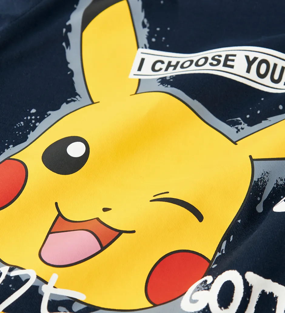Sej Name It bluse i navyblå med stort Pokémon-print på fronten. Blusen har en rund halsudskæring med en smal ribkant og lange ærmer.