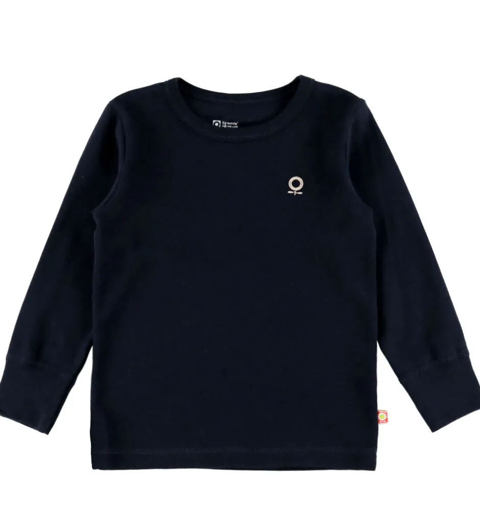 Stilfuld Katvig bluse i navyblå med et lille, hvidt logo broderet på venstre bryst. Blusen har en rund halsudskæring og lange ærmer med brede ribkanter.