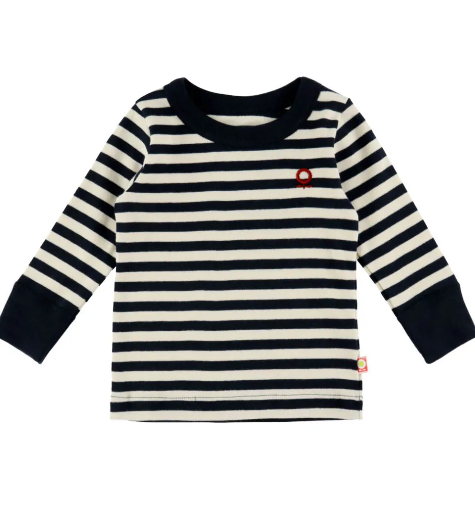 Fin Katvig bluse med stribet design i navyblå og hvid. På venstre bryst er der broderet et lille, rødt logo. Blusen har en rund halsudskæring og lange ærmer med brede ribkanter.