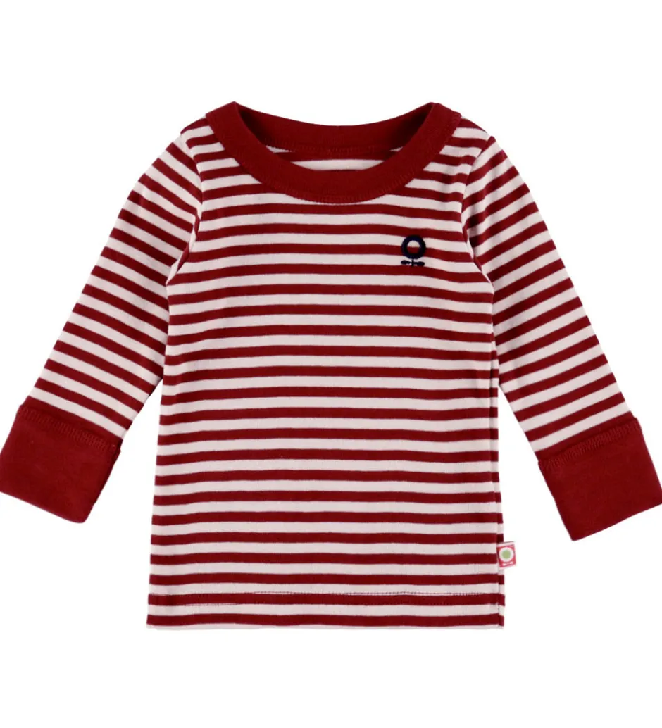 Sød Katvig bluse med stribet design i rød og hvid. På venstre bryst er der broderet et lille, navyblåt logo. Blusen har en rund halsudskæring og lange ærmer med brede ribkanter.