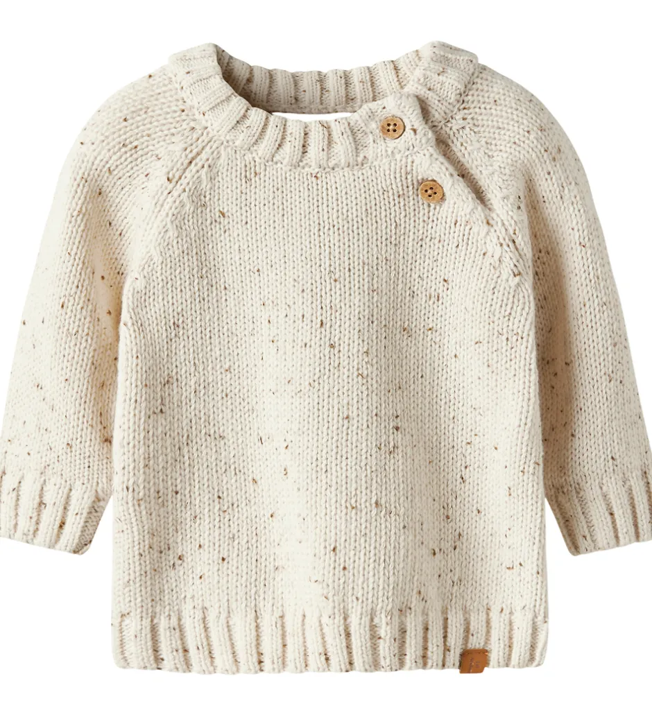 Elegant Lil Atelier bluse i lys beige med brune nister. Blusen har en strikket struktur med rund halsudskæring og knapper ved venstre skulder. Den har lange ærmer og ribkanter ved alle åbninger.